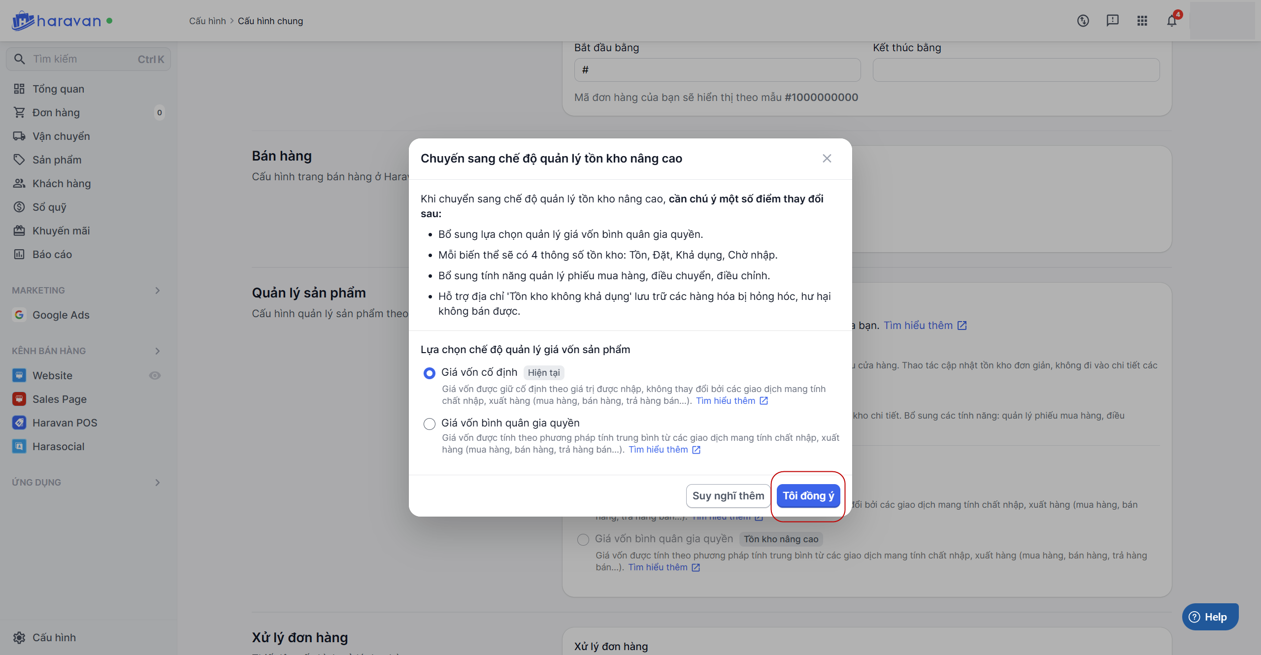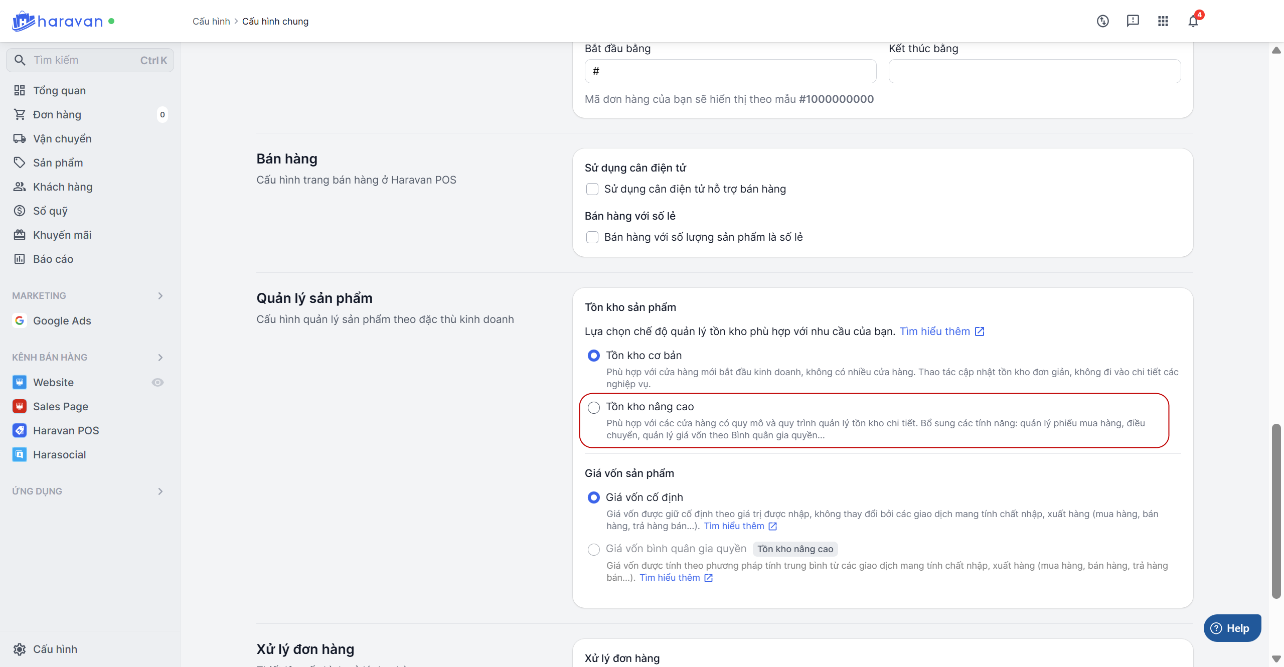 - Lướt xuống mục Quản lý sản phẩmvà chọn chế độ tồn kho Nâng cao.