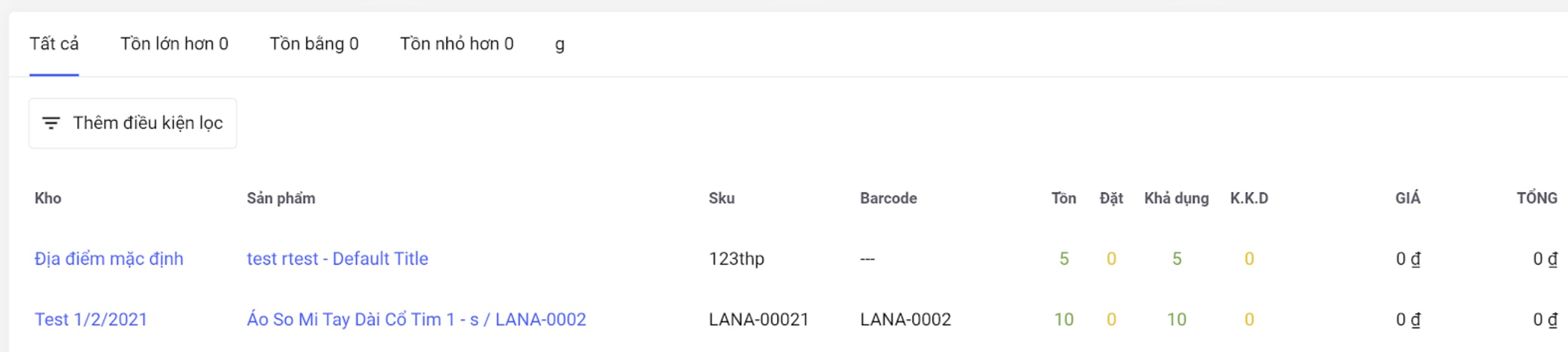 | Tổng giá trị | Giá trị này bằng Tổng tồn kho sản phẩm nhân với giá vốn |