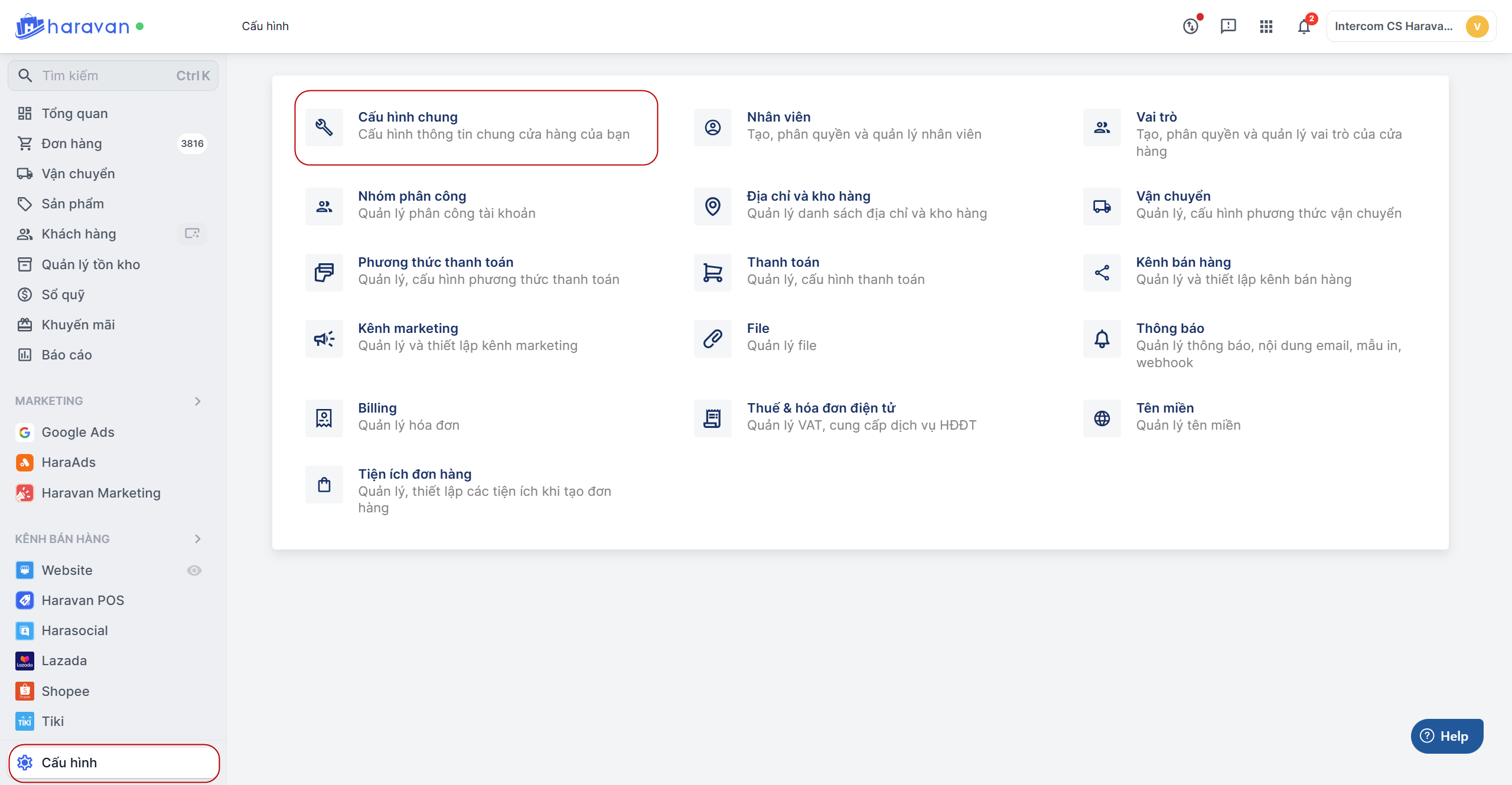 - Trong phần admin Haravan, vào mục Cấu hình > Chọn Cấu hình chung.