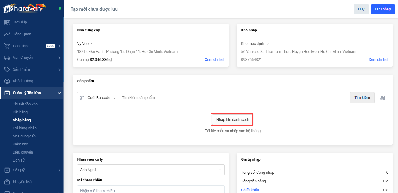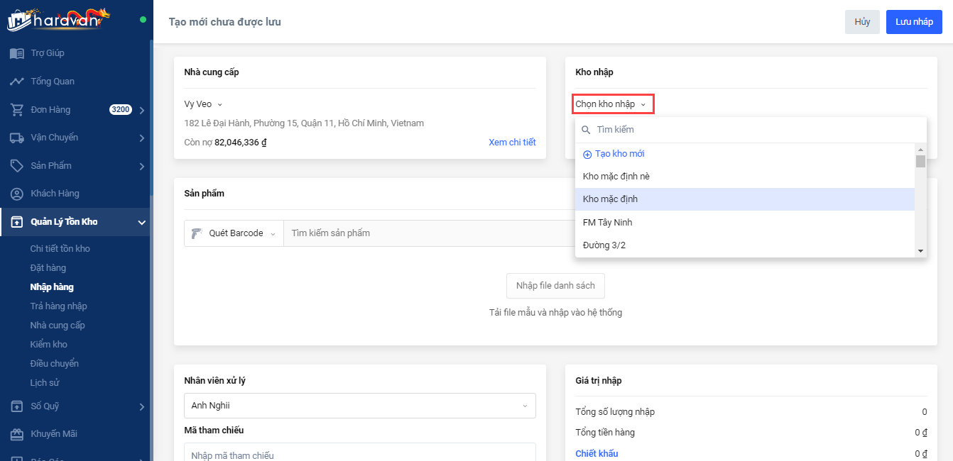 Bước 3: Chọn kho nhập trong danh sách các kho đã tạo trong Cấu hình địa chỉ hoặc tạo kho mới nếu chưa có thông tin kho này trên hệ thống.