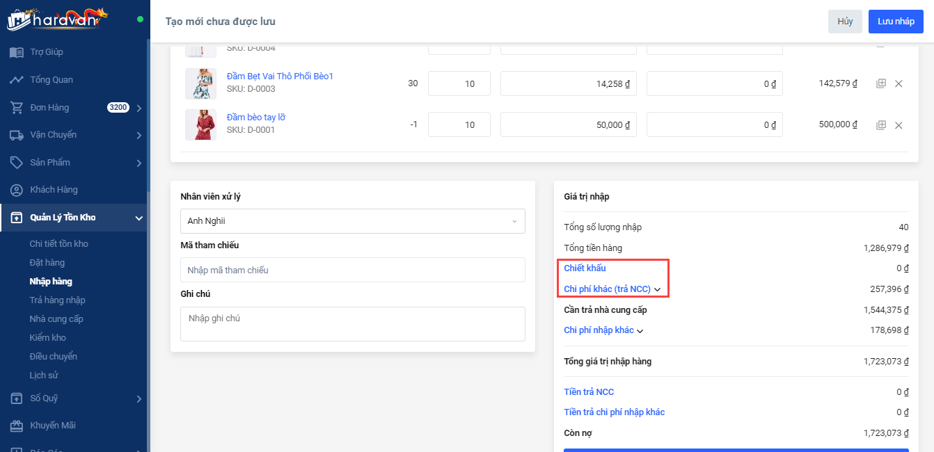 Bước 5: Thêm chiết khấu trên tổng đơn nhập và các chi phí nhập hàng khác cần trả nhà cung cấp (nếu có)