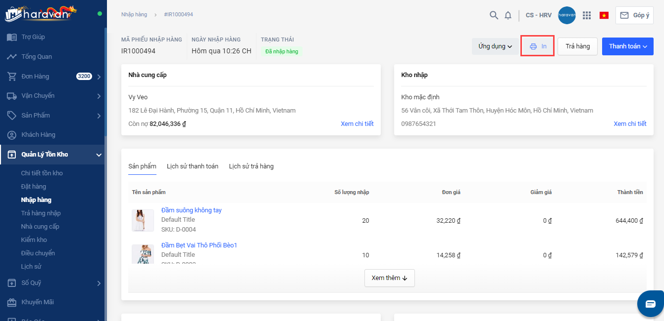 Bạn vào trang chi tiết phiếu nhập mà bạn muốn in