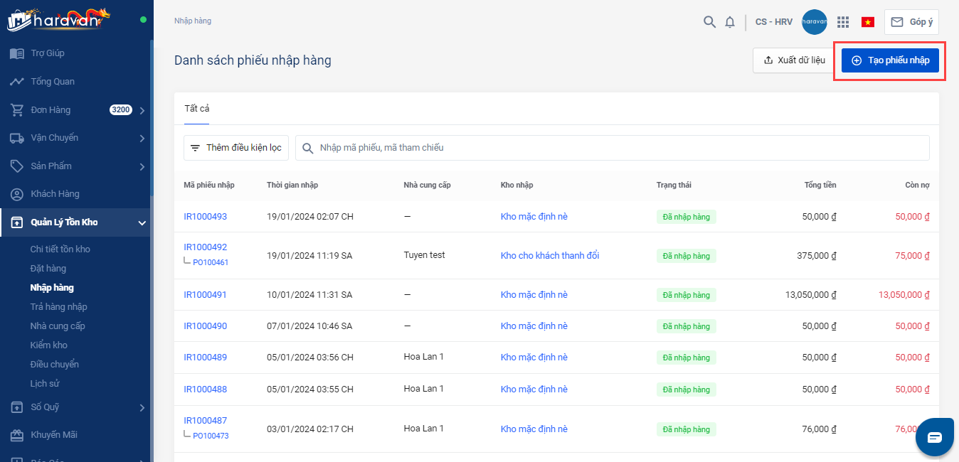 Bước 1: Tại menu Quản lý tồn kho bạn chọn menu con Nhập hàng -> Tạo phiếu nhập hàng