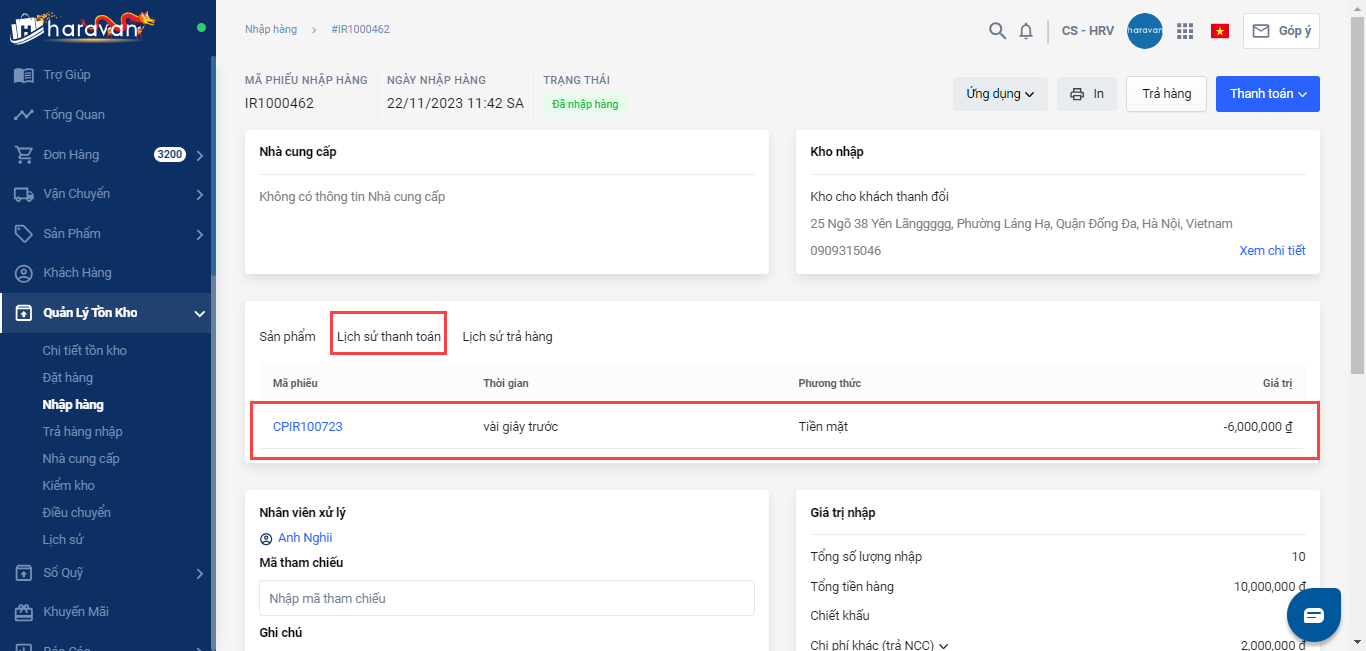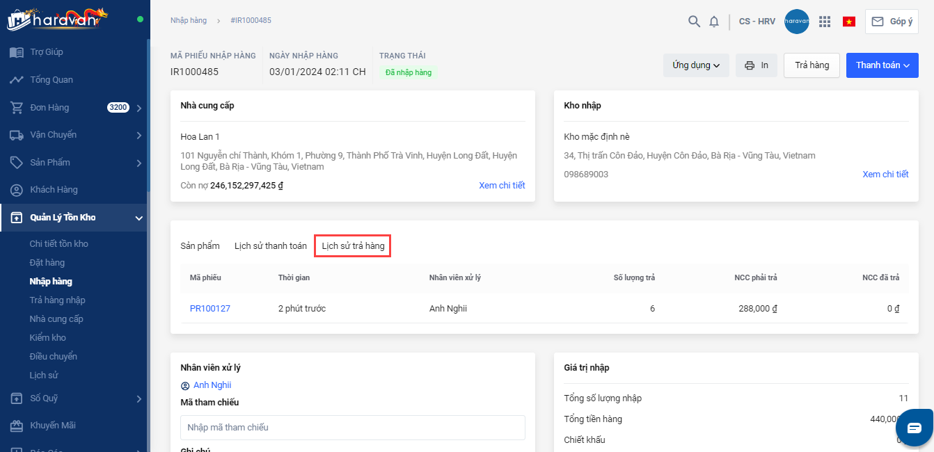 Mỗi phiếu nhập hàng có thể trả hàng nhiều lần cho đến khi hết số lượng sản phẩm trên phiếu nhập hàng, mỗi lần trả hàng, hệ thống sẽ ghi nhận lại trong lịch sử trả hàng. Bạn có thể xem lại lịch sử trả hàng trên từng phiếu nhập như sau: