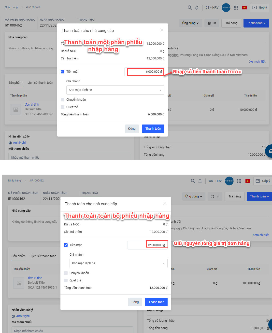 3. Nhập số tiền thanh toán trước cho nhà cung cấp nếu bạnchỉ thanh toán một phần phiếu nhập (không bắt buộc). Hoặc giữ nguyên số tiền nếu bạn thanh toán toàn bộ phiếu nhập-> chọn Thanh toán để hoàn tất