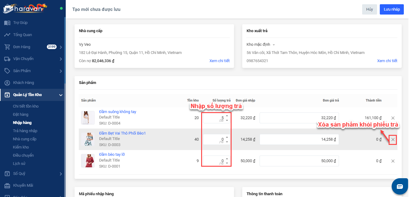 2. Thực hiện nhập số lượng sản phẩm trảhoặc chọn dấu X để xóa sản phẩm khỏi phiếu trả