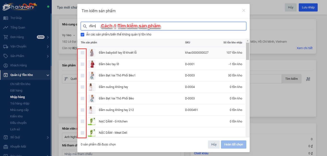 - Cách 1: Tìm kiếm và chọn trực tiếp sản phẩm cần nhập trên hệ thống - phù hợp khi bạn nhập không quá nhiều sản phẩm -> Điều chỉnh số lượng nhập, đơn giá, giảm giá cho sản phẩm (nếu có)