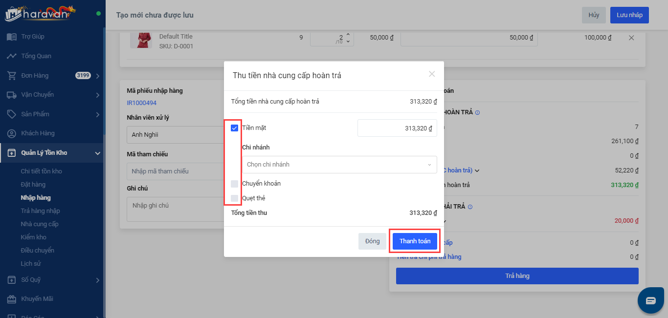 - Nếu bạn đã nhận tiền các sản phẩm trả từ nhà cung cấp, bạn chọn Đã thu nhà cung cấp -> chọn phương thức thanh toán -> chọn Thanh toán để hoàn tất