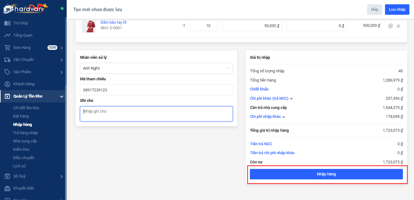 Bước 9 Chọn Nhập hàng để tạo phiếu nhập hàng