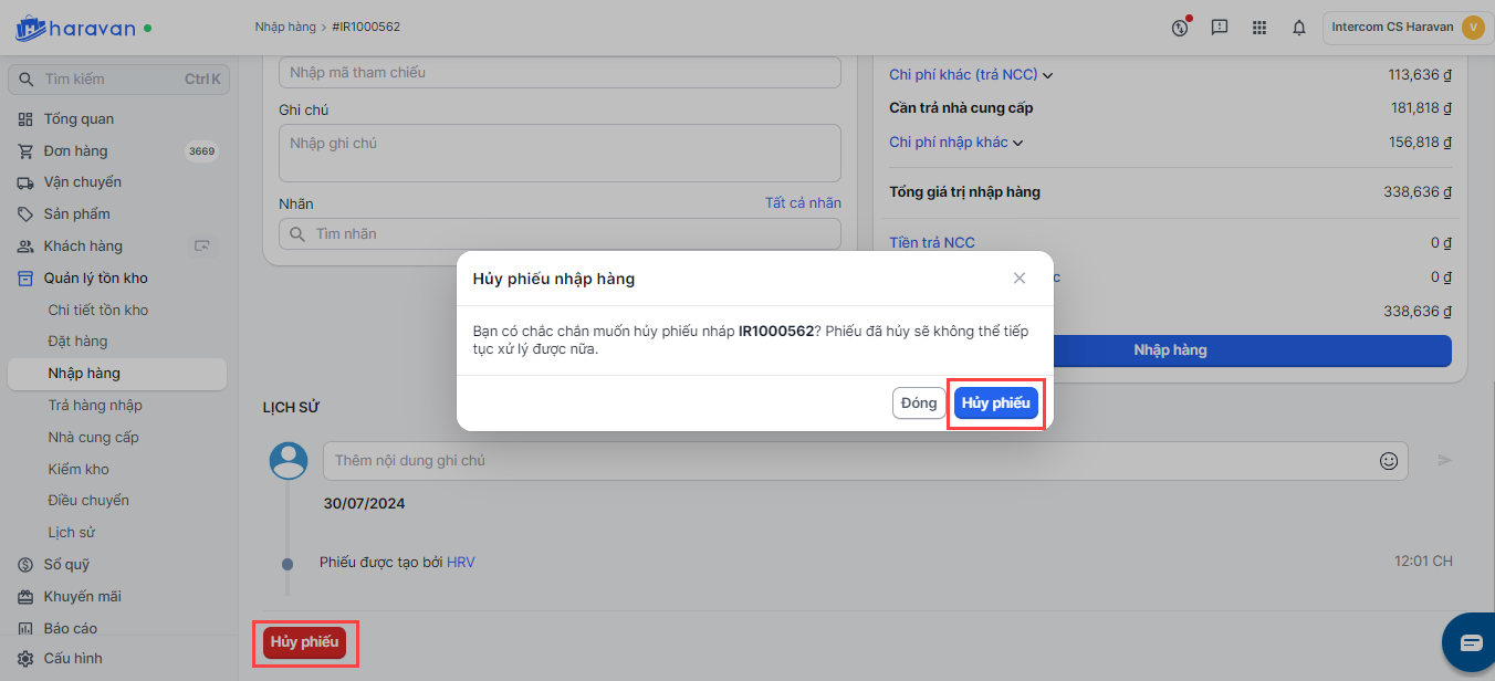 Hủy phiếu nhập hàng