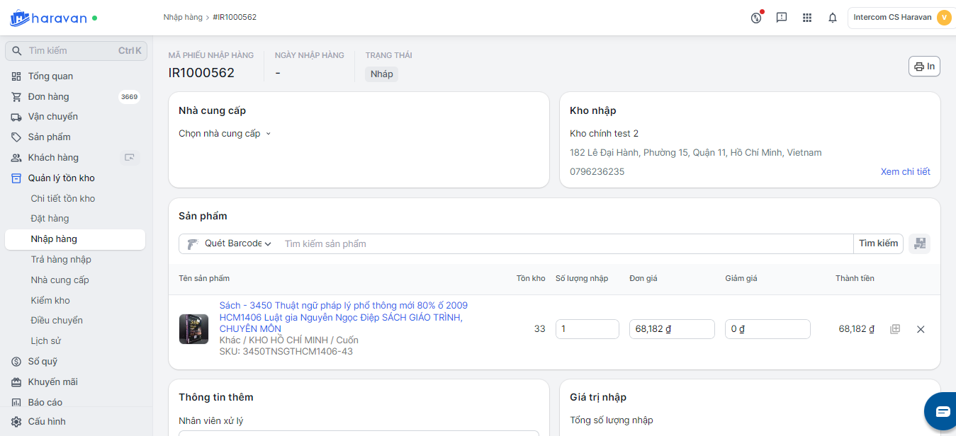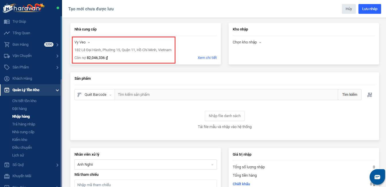 Bước 3: Chọn kho nhập trong danh sách các kho đã tạo trong Cấu hình địa chỉ hoặc tạo kho mới nếu chưa có thông tin kho này trên hệ thống.