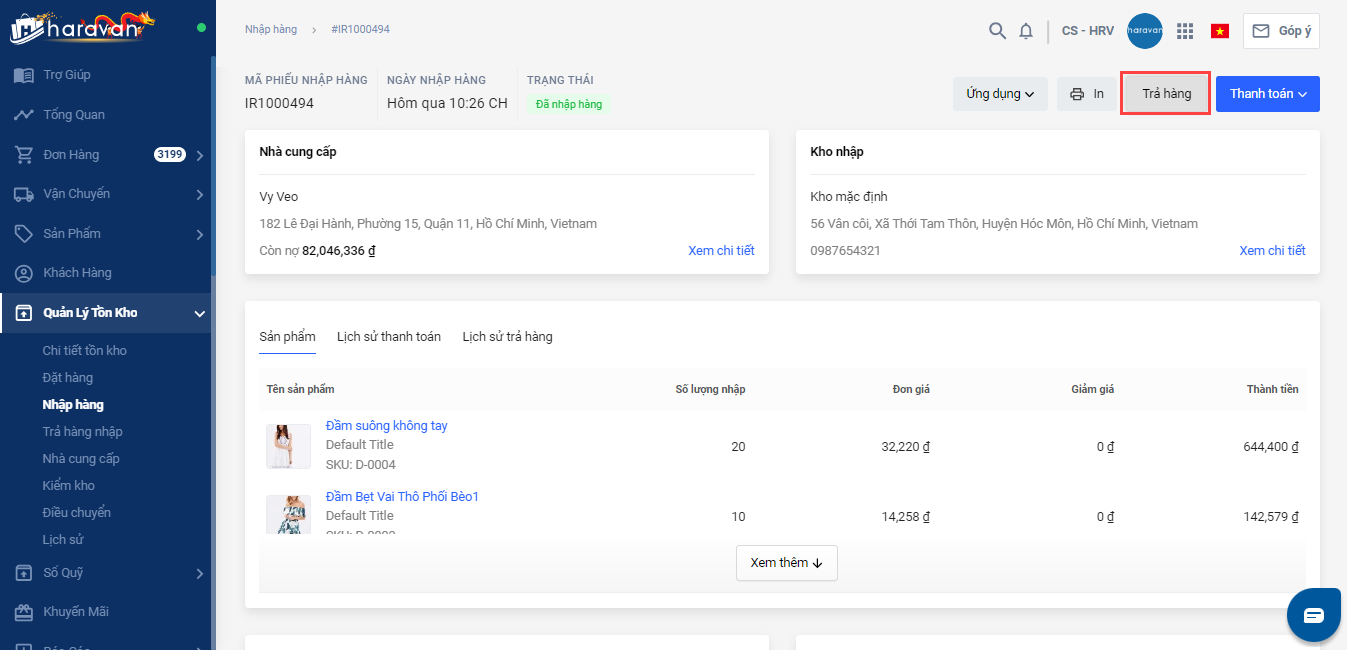 Mỗi phiếu nhập hàng có thể trả hàng nhiều lần cho đến khi hết số lượng sản phẩm trên phiếu nhập hàng, mỗi lần trả hàng, hệ thống sẽ ghi nhận lại trong lịch sử trả hàng. Bạn có thể xem lại lịch sử trả hàng trên từng phiếu nhập như sau: