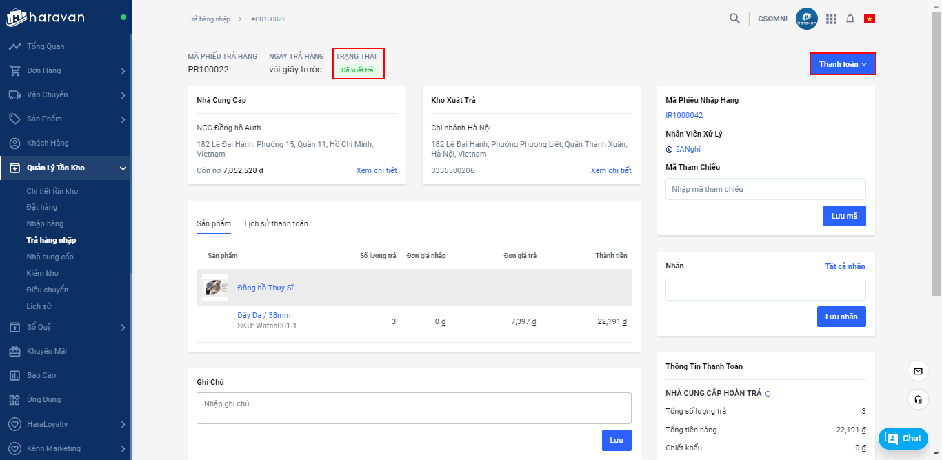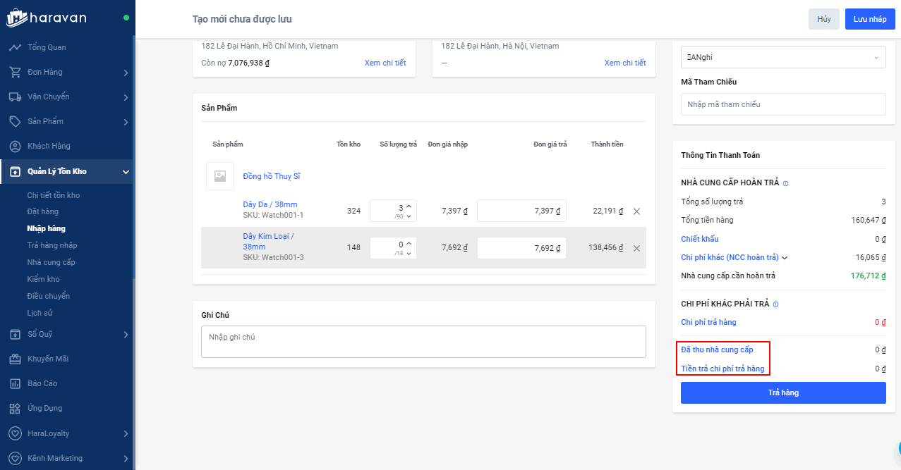Nếu chưa thanh toán ngay thì khi xác nhận trả hàng, các khoản chi phí này sẽ được ghi nhận vào công nợ của nhà cung cấp. Và bạn có thể trả hàng trước rồi xác nhận thanh toán sau.