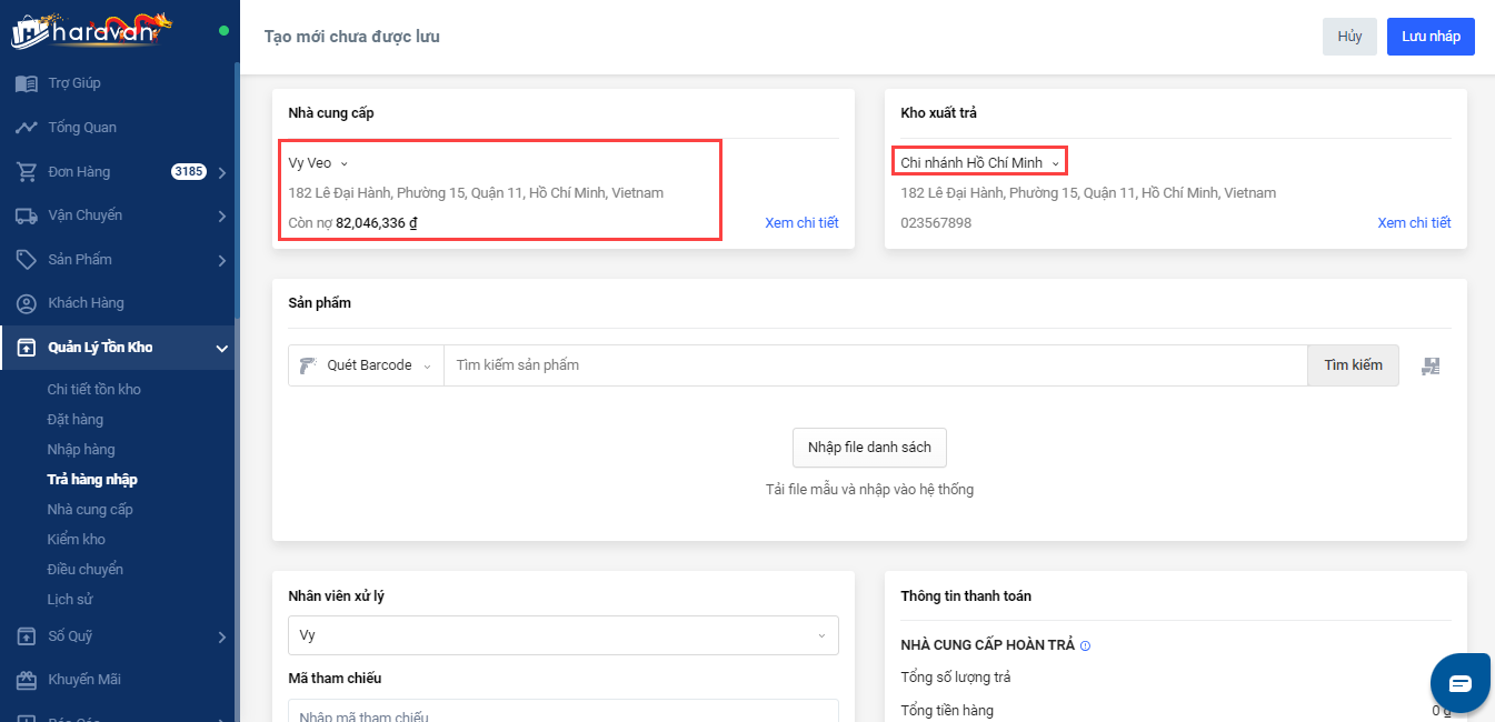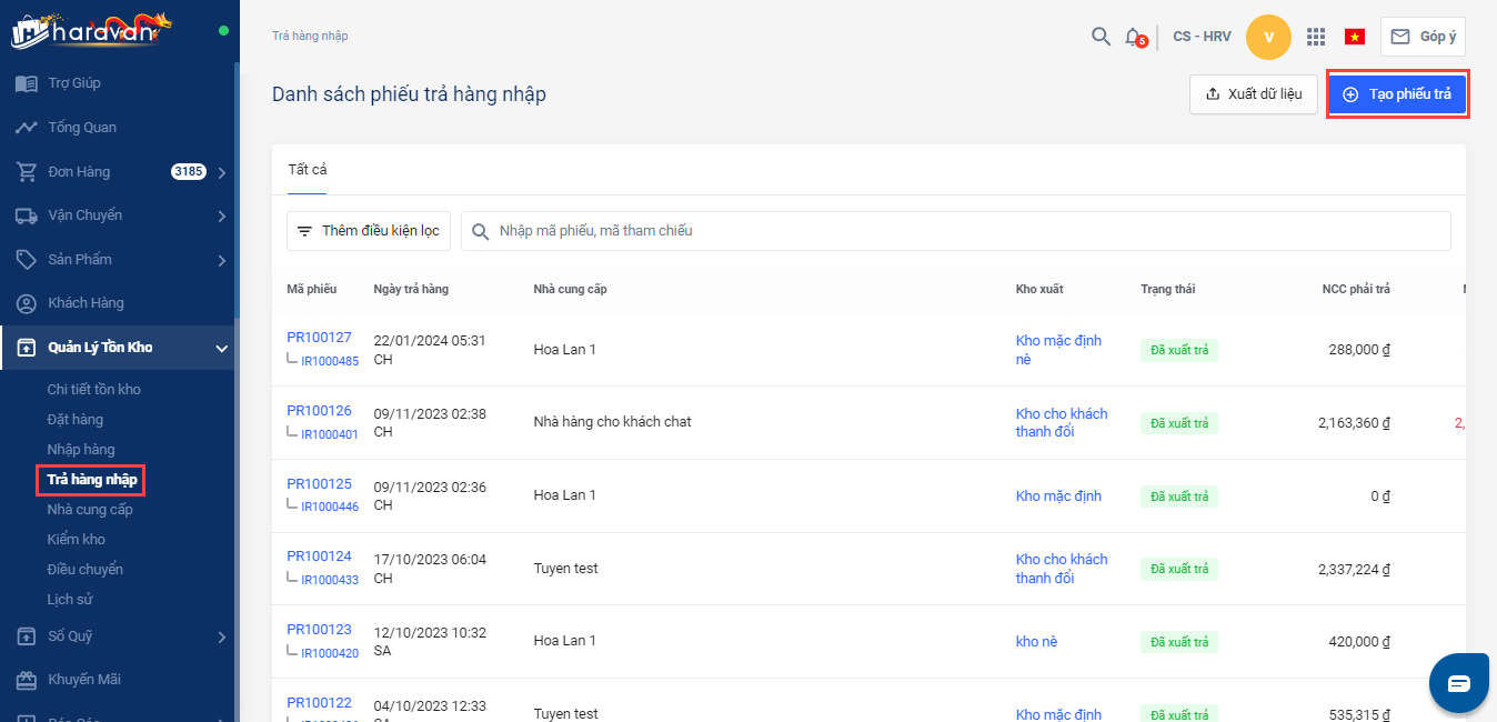 Bước 1: Vào menu Quản lý tồn kho > Trả hàng nhập > Tạo phiếu trả