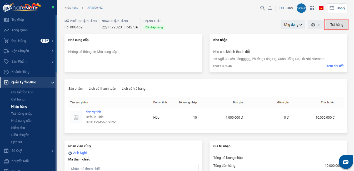 Bước 1: Tìmphiếu nhập hàng đã tạo trước đó, nhấn Trả**hàng**