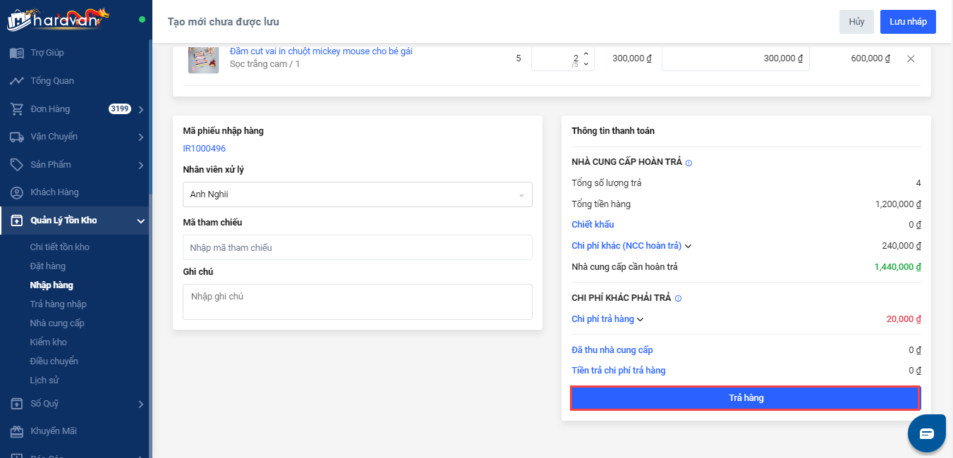 Bước 4: Chọn Trả hàng để hoàn tất tạo phiếu