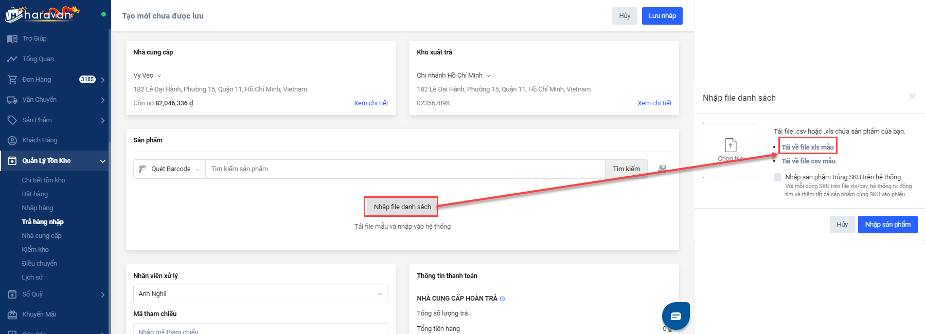 - Cách 2: Nhập danh sách sản phẩm bằng file excel - phù hợp với khi bạn cần nhập số lượng lớn sản phẩm và để ra số lượng cần nhập bạn phải tính toán và xử lý dữ liệu ở ngoài. Bạn chọn Nhập file danh sách -> Chọn tải file mẫu xls mẫu
