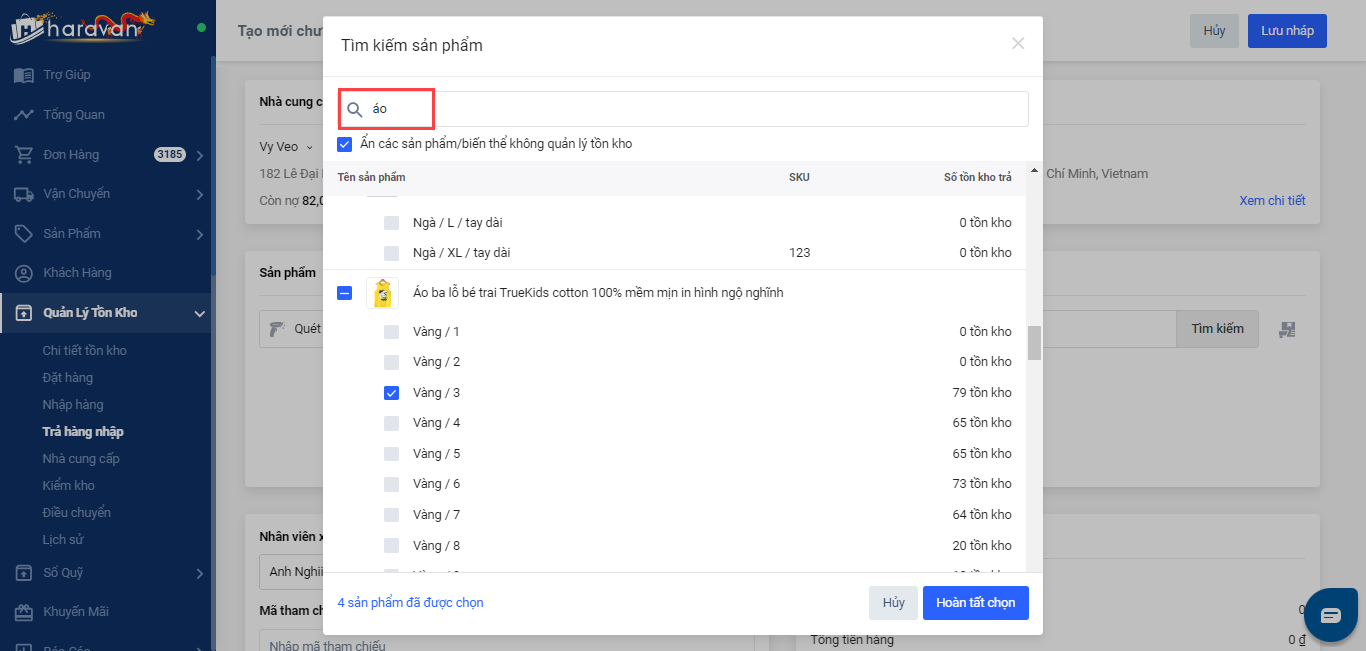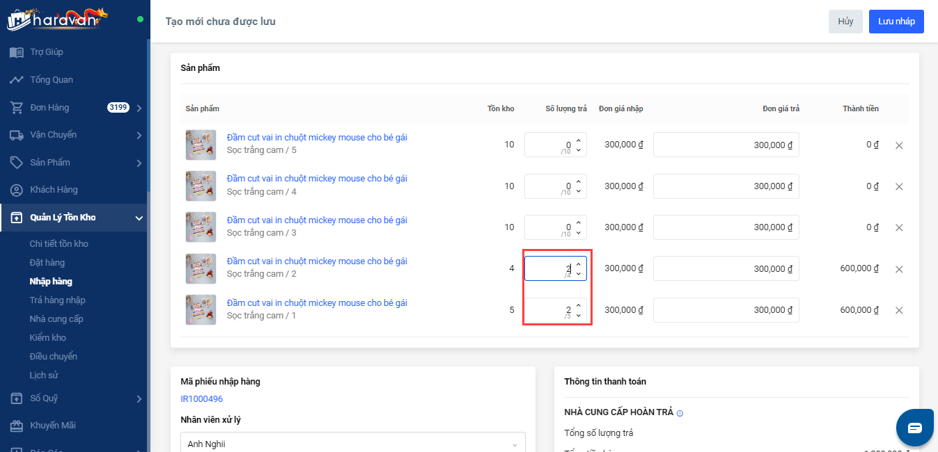Bước 2: Nhập số lượng sản phẩm muốn trả hàng