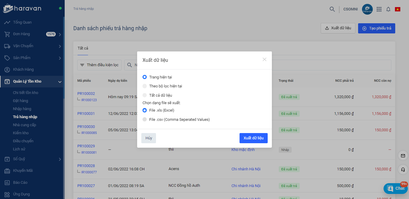 Để thực hiện xuất dữ liệu phiếu trả hàng, nhà bán hàng thực hiện vào Quản lý tồn kho -> Trả hàng nhập -> Xuất dữ liệu. Tại đây nhà bán hàng có thể chọn xuất dữ liệu theo trang hiện tại, theo bộ lọc hoặc tất cả dữ liệu.