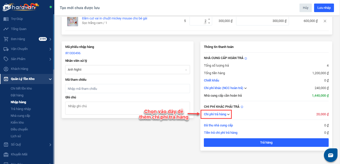 Bước 3: Nhập các khoản bạn phải chi thêm khi trả hàng nhập (nếu có). Ví dụ chi phí nhân công bóc xếp hàng...
