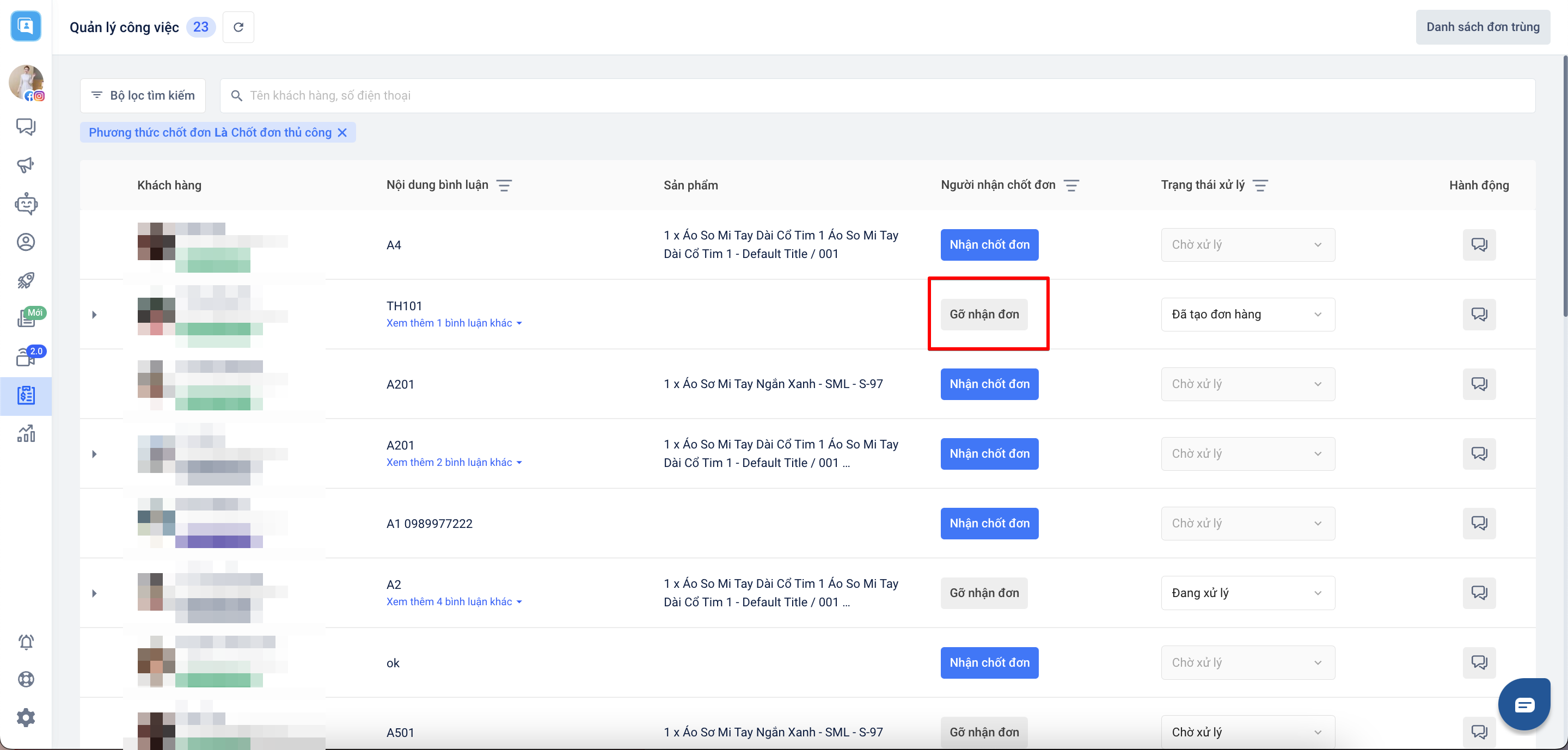 - Để tránh rớt đơn do nhận chốt đơn nhiều khách hàng nhưng không tư vấn kịp → nên bấm nhận chốt đơn và tương tác với từng khách, khi nào xong mới chuyển sang khách tiếp theo.