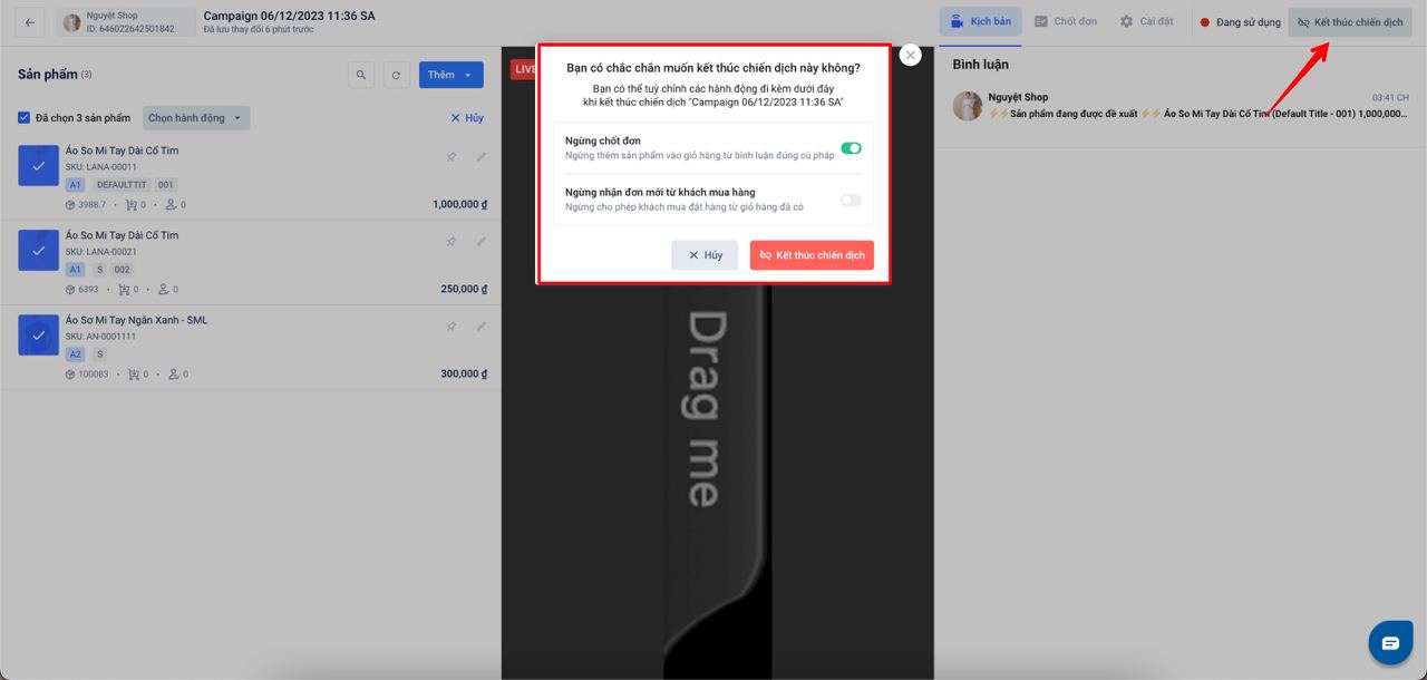 Với thao tác kết thúc chiến dịch tại Harasocial bạn có thể tùy chỉnh các hành động đi kèm bao gồm: Ngừng chốt đơn & Ngừng nhận đơn từ khách mua hàng.