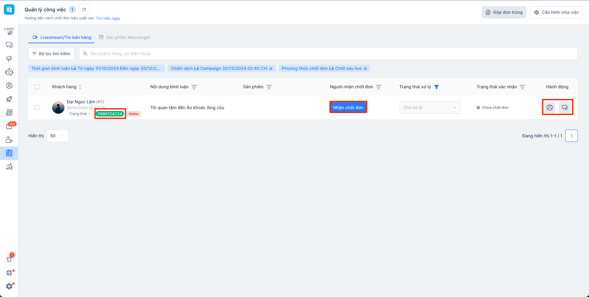 Tại giao diện "Quản lý công việc", bạn sẽ thấy bình luận của khách hàng trong bài Livestream: