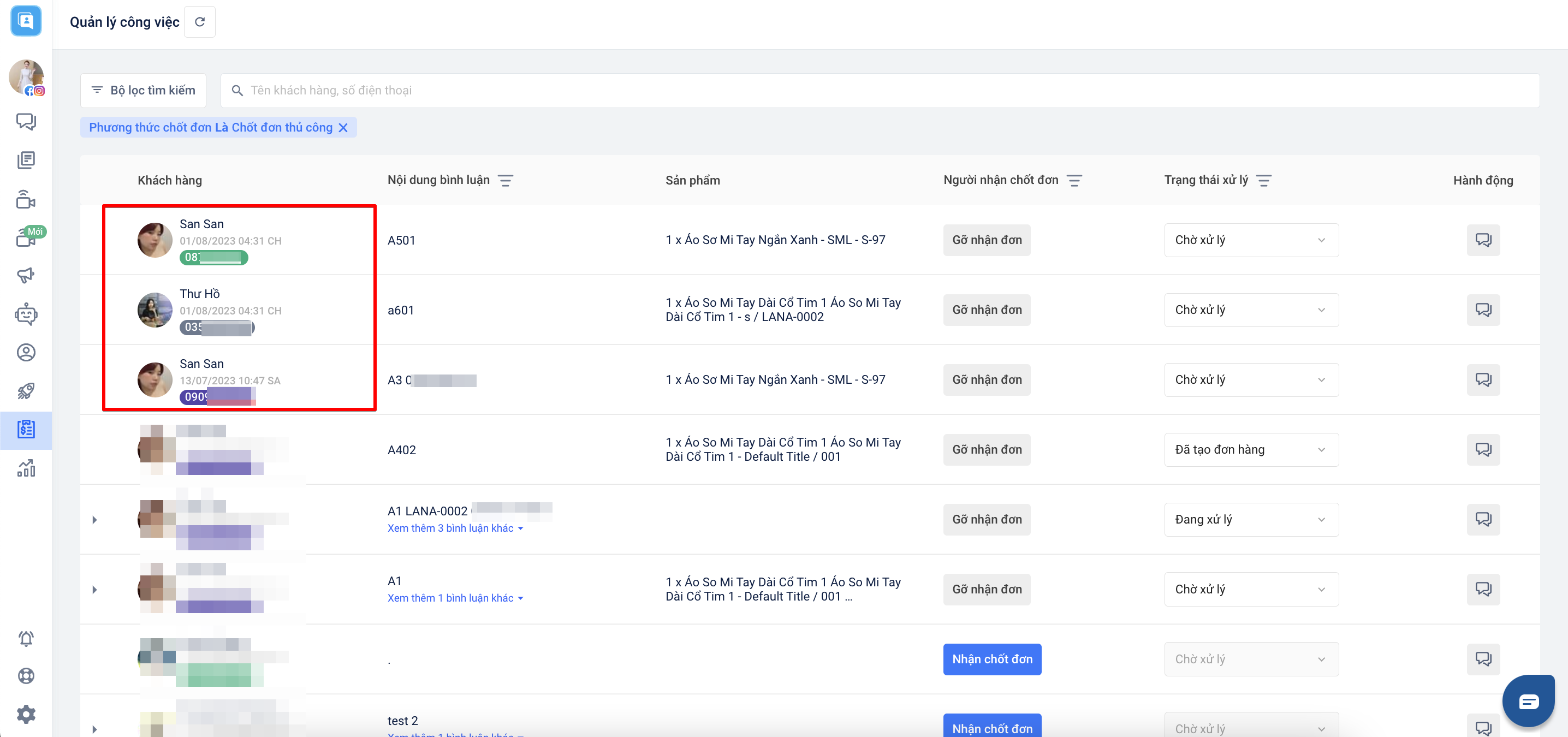 - Thông tin khách hàng: Tên, ngày tháng năm và giờ bình luận, trạng thái khách hàng, số điện thoại, nhà mạng.