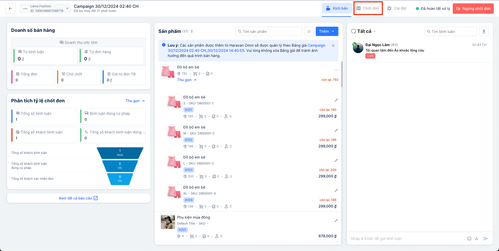 Đối với phương thức chốt đơn sau Live, doanh nghiệp chỉ cần thực hiện Livestream trước trên Fanpage của mình, sau đó vào Harasocial, tạo chiến dịch Livestream và kết nối với bài Livestream đó. Khi đã hoàn tất kết nối, hệ thống cần một chút thời gian để dò quét lại các bình luận trong phiên Live đó.