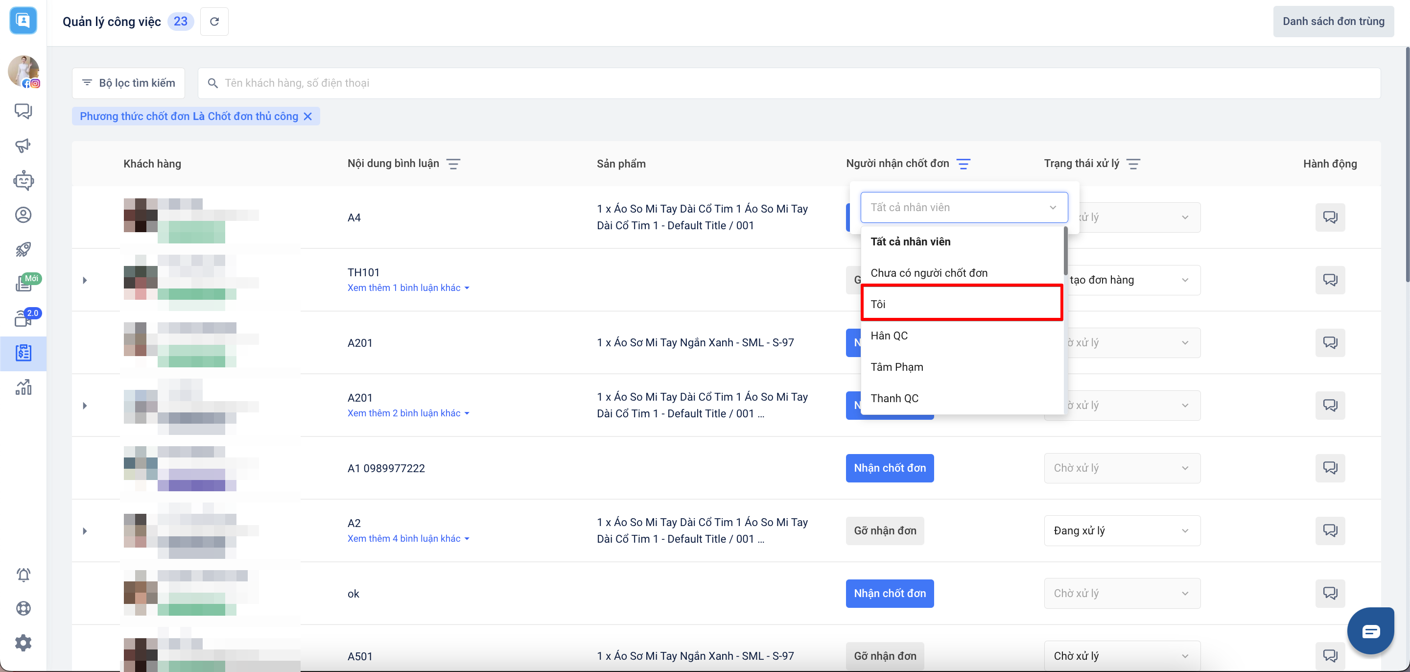 - Nếu bạn vô tình nhấn nhận chốt đơn với nhiều khách, bạn có thể sử dụng bộ lọc Nhân viên chốt đơn chọn “Tôi” để xử lý từng khách.