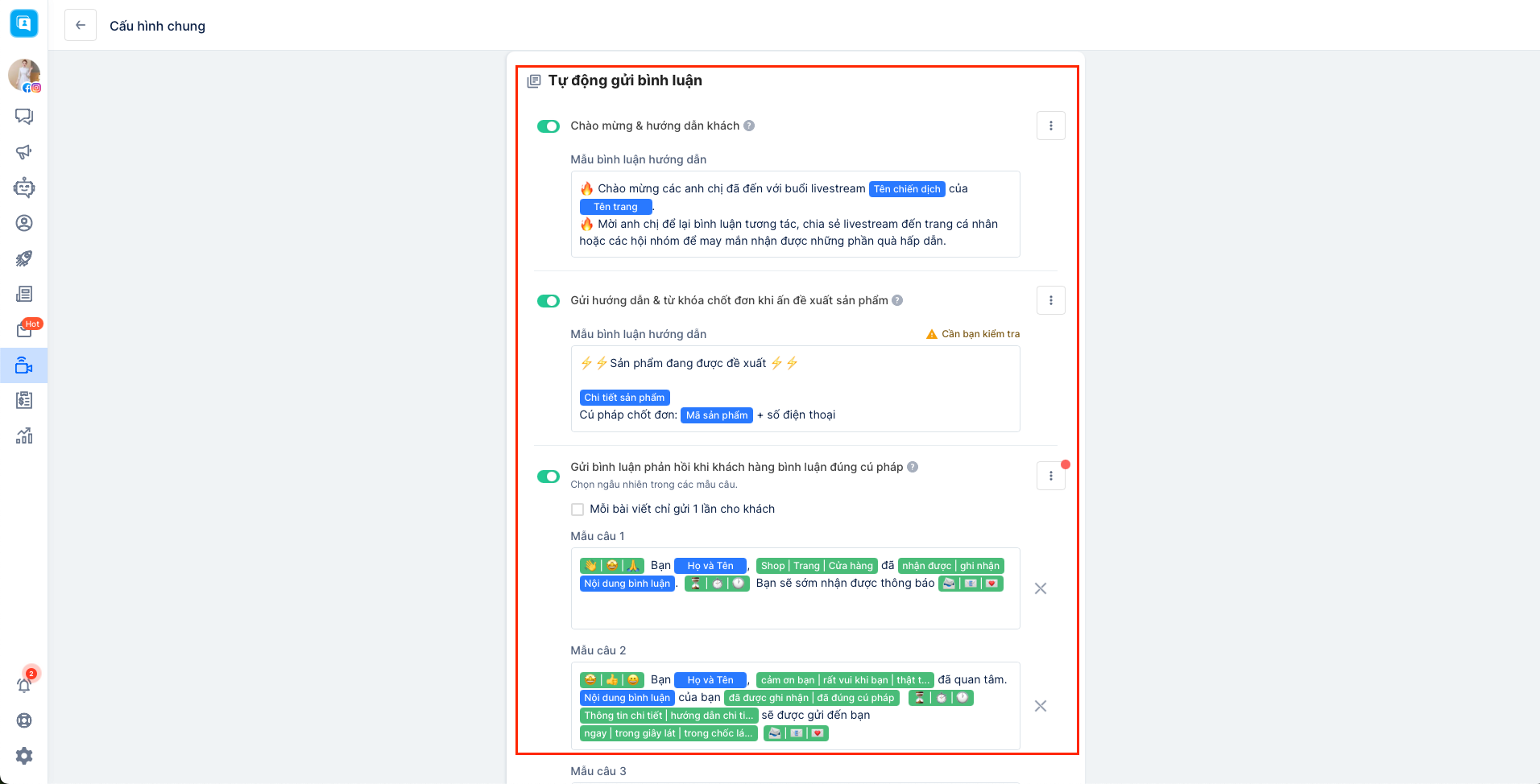 - Bình luận phản hồi khi khách hàng bình luận đúng cú pháp:Hệ thống sẽ tự động gửi bình luận phản hồi cho khách hàng theo nhiều mẫu câu ngẫu nhiên. Tại đây hệ thống sẽ hiển thị mặc định6 mẫu câu để gửi, bạn có thể thêm đượctối đa 10 mẫu câuvà hệ thống sẽ tự động phản hồi ngẫu nhiên xen kẻ trong 10 mẫu câu đó.