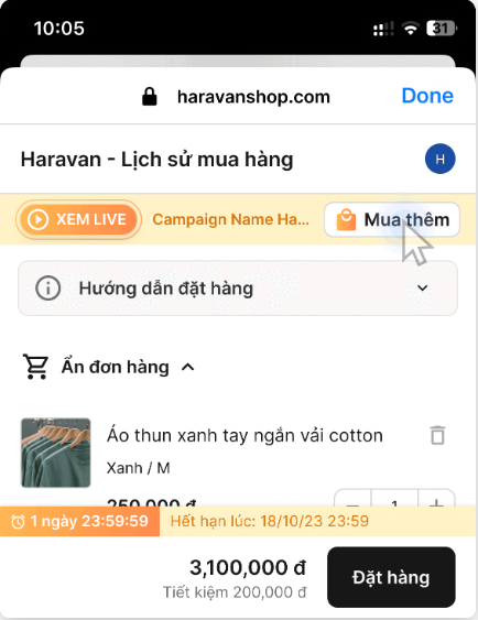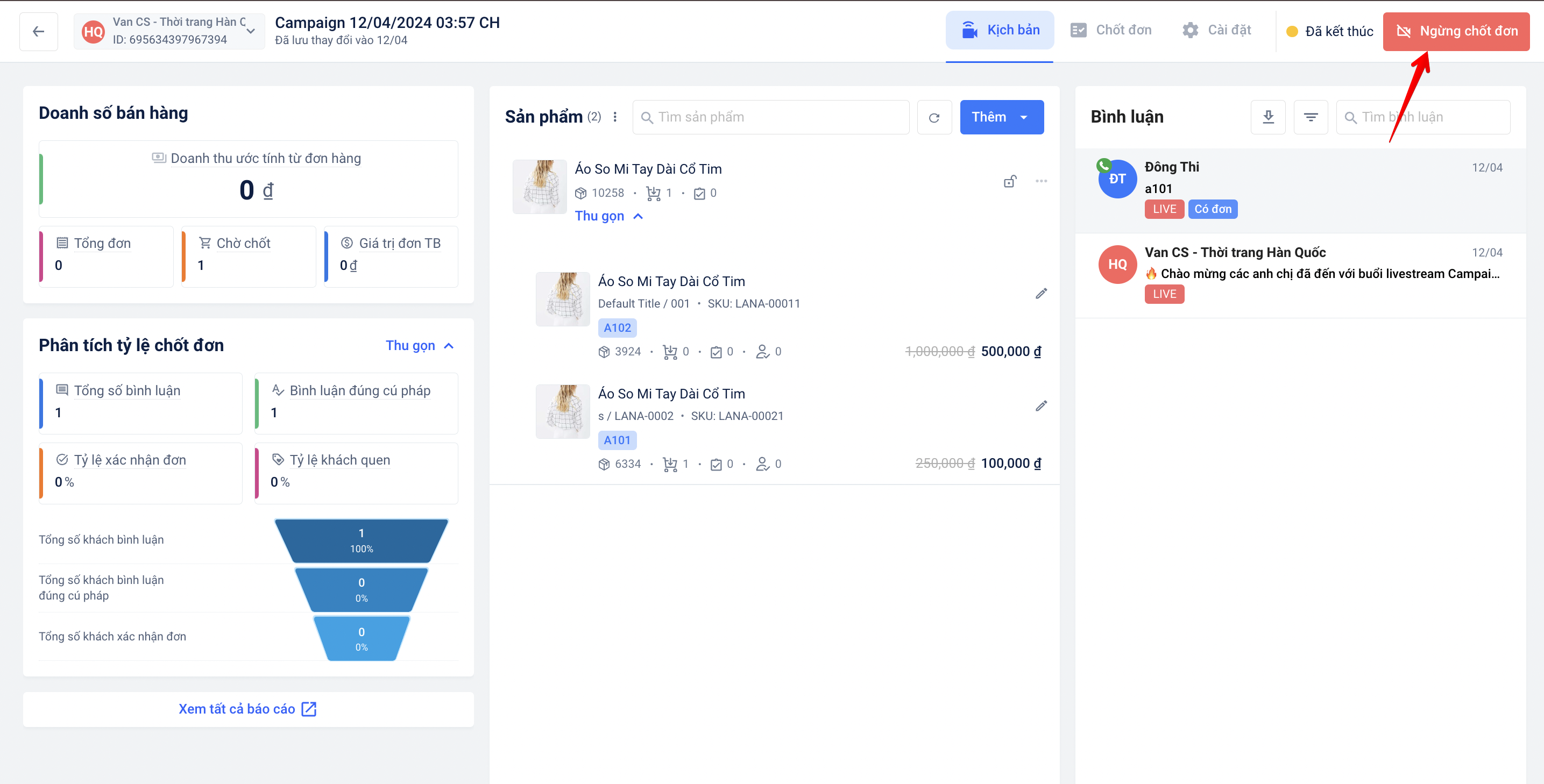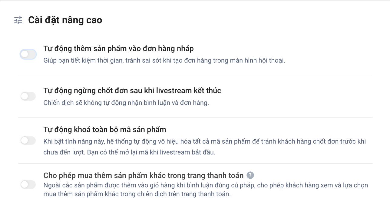 Tự động ngừng chốt đơn sau khi Livestream kết thúc:Chiến dịch sẽ không tự động nhận thêm bình luận. Nếu không kích hoạt tính năng này, khi chiến dịch Livestream kết thúc, khách hàng vẫn có thể xem lại video Livestream đó và chốt đơn, khi đó nếu muốn ngừng nhận thêm đơn, bạn cần nhấn vào nút Ngừng chốt đơn tại đây.