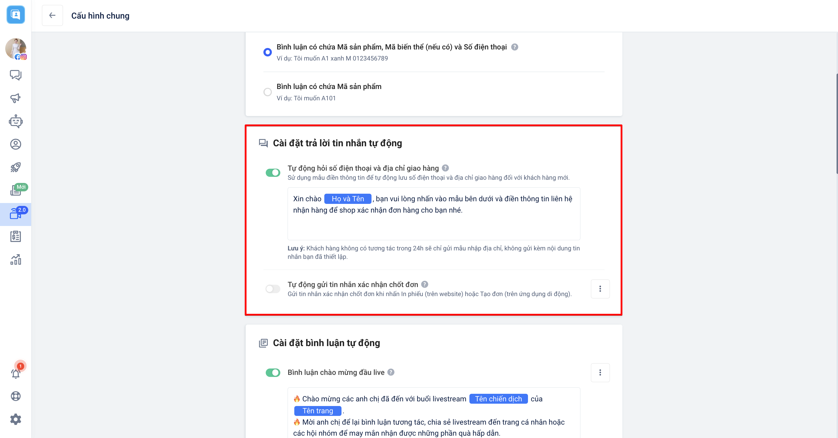 **Lưu ý:**Khách hàng không có tương tác trong 24hsẽ chỉ gửi mẫu nhập địa chỉ, không gửi kèm nội dung tin nhắn bạn đã thiết lập.