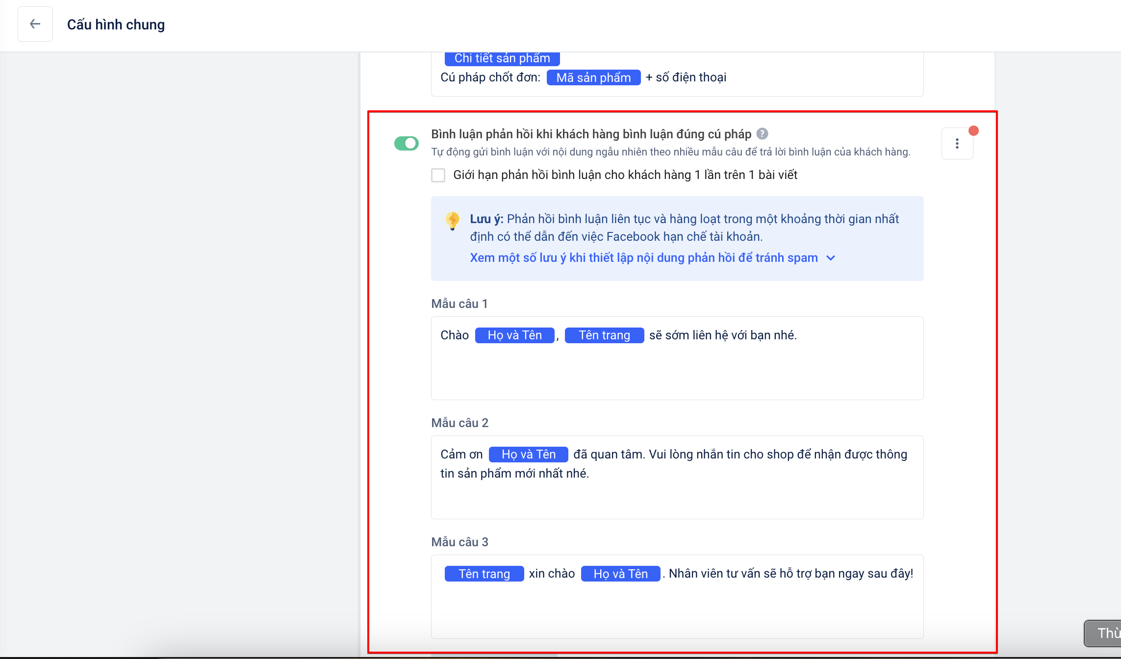 Bên cạnh đó, khi tích chọn vào nút "Giới hạn phản hồi bình luận cho khách hàng 1 lần trên 1 bài viết", với mỗi bình luận đúng cú pháp chốt đơn đầu tiên của khách hàng sẽ nhận được 1 phản hồi tự động, từ bình luận đúng cú pháp thứ 2 trở đi sẽ không có phản hồi. Công cụ này khuyến khích các shop có lượng tương tác qua bình luận cao dẫn đến trường hợp bị thông báo spam từ Facebook nên sử dụng để giới hạn lại lượng phản hồi một cách hợp lý hơn.