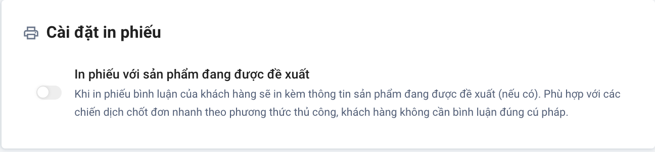 *In phiếu với sản phẩm đang được đề xuất******:* Khi in phiếu bình luận của khách hàng sẽ in kèm thông tin sản phẩm đang được đề xuất (nếu có). Phù hợp với các chiến dịch chốt đơn nhanh theo phương thức thủ công, khách hàng không cần bình luận đúng cú pháp.