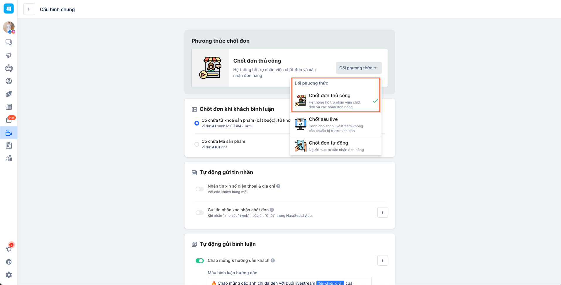 Hiện tại HaraSocial hỗ trợ bạn 3 phương thức chốt đơn bao gồm:sau live,**thủ công và tự động**. Trong bài hướng dẫn này, HaraSocial sẽ hướng dẫn bạn chi tiết các thiết lập của phương thức chốt đơn thủ công.