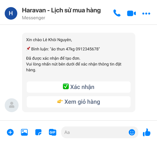 - Tự động gửi tin nhắn xác nhận chốt đơn: Hệ thống sẽ tự động gửi tin nhắn xác nhận chốt đơn khi bạn thực hiện nhấn In phiếu (trên website) hoặc nút Tạo đơn (trên ứng dụng di động HaraSocial mobile).