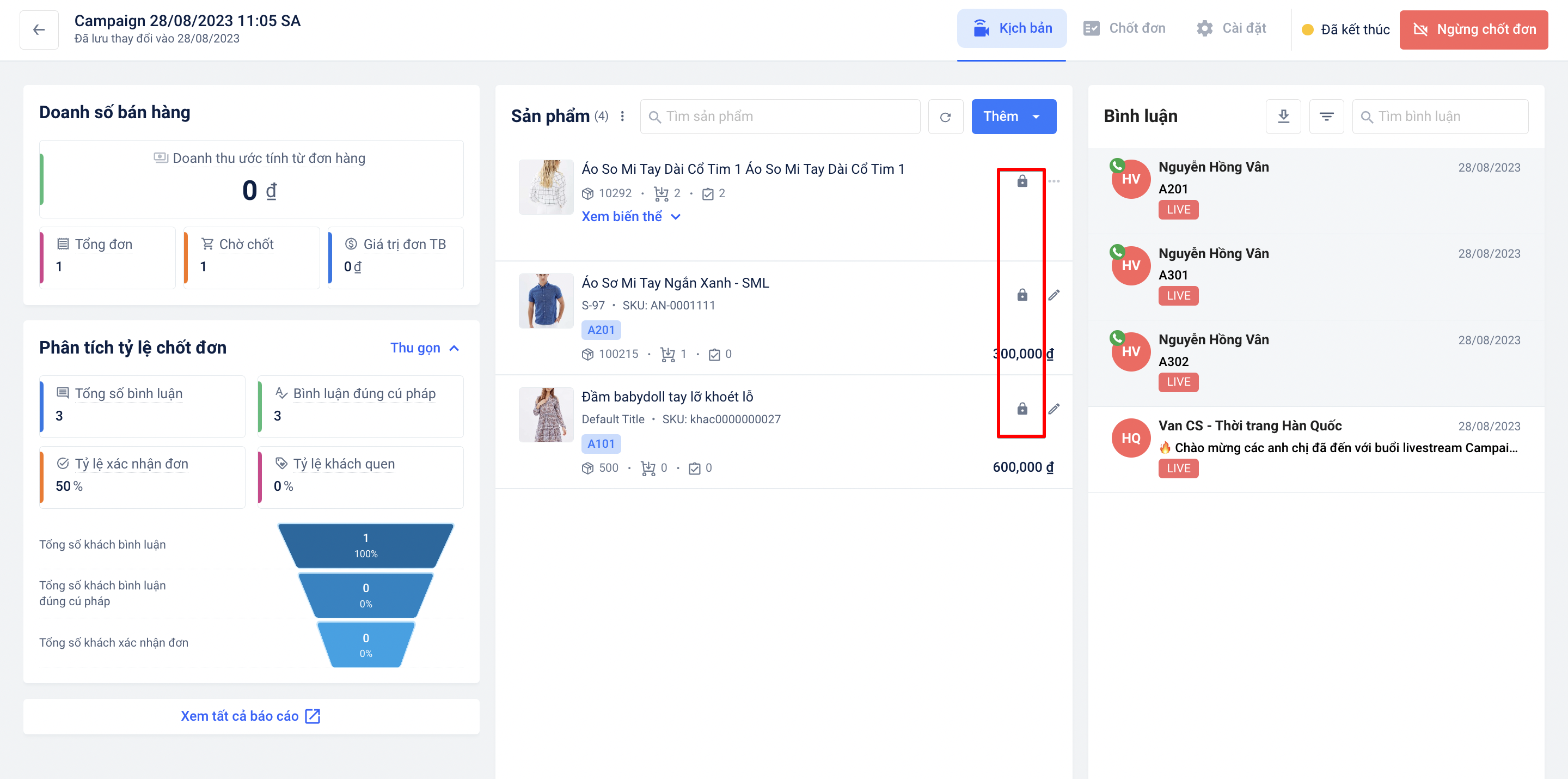 - Tự động khóa toàn bộ từ khóa chốt đơn:Với tính năng này, hệ thống tự động vô hiệu hóa tất cả từ khóa sản phẩm để tránh khách hàng chốt đơn trước khi chưa đến lượt. Bạn có thể mở lại từ khóa khi livestream bắt đầu.