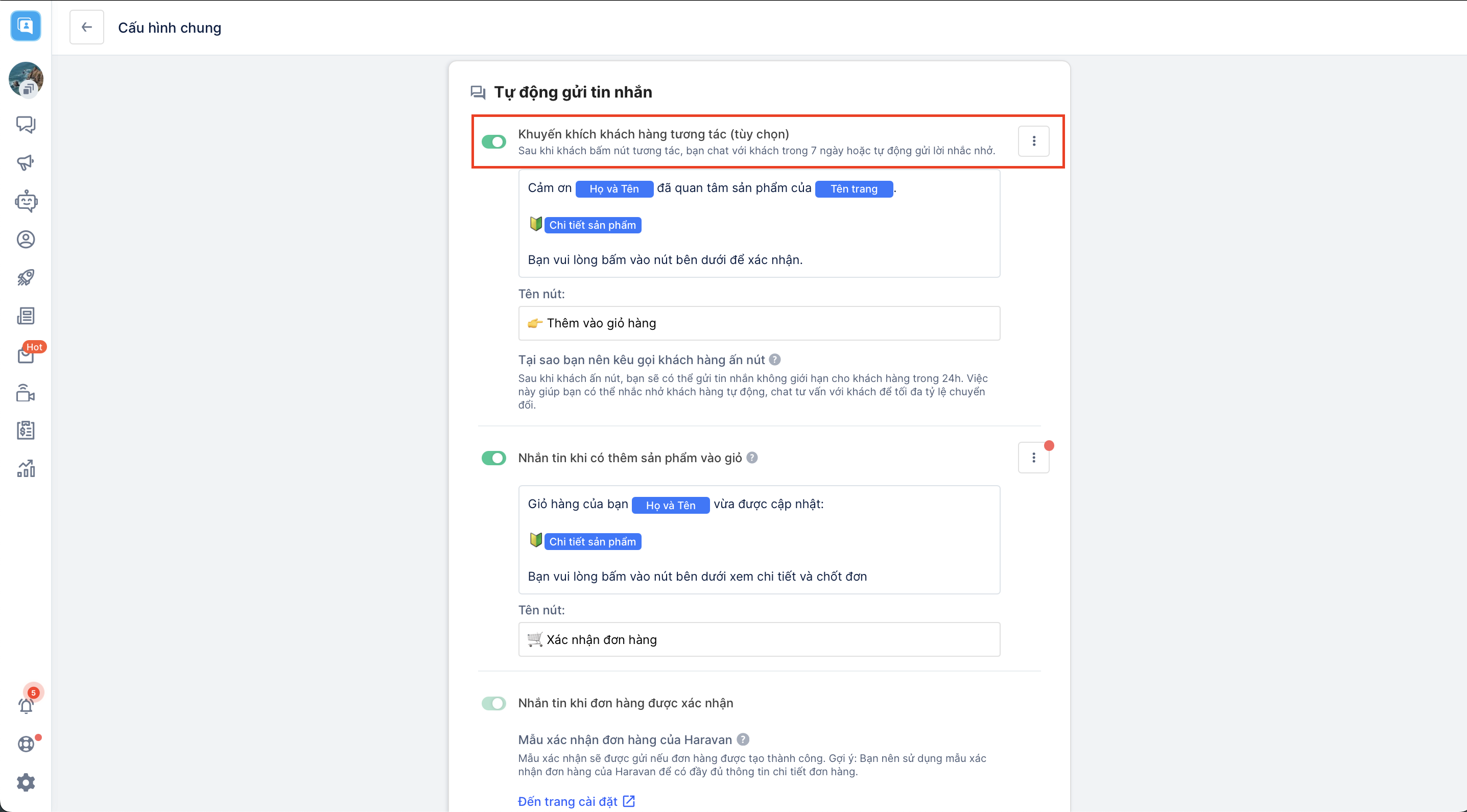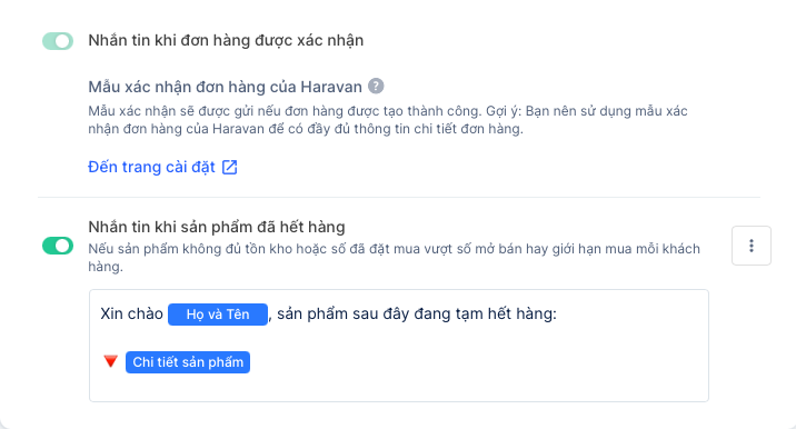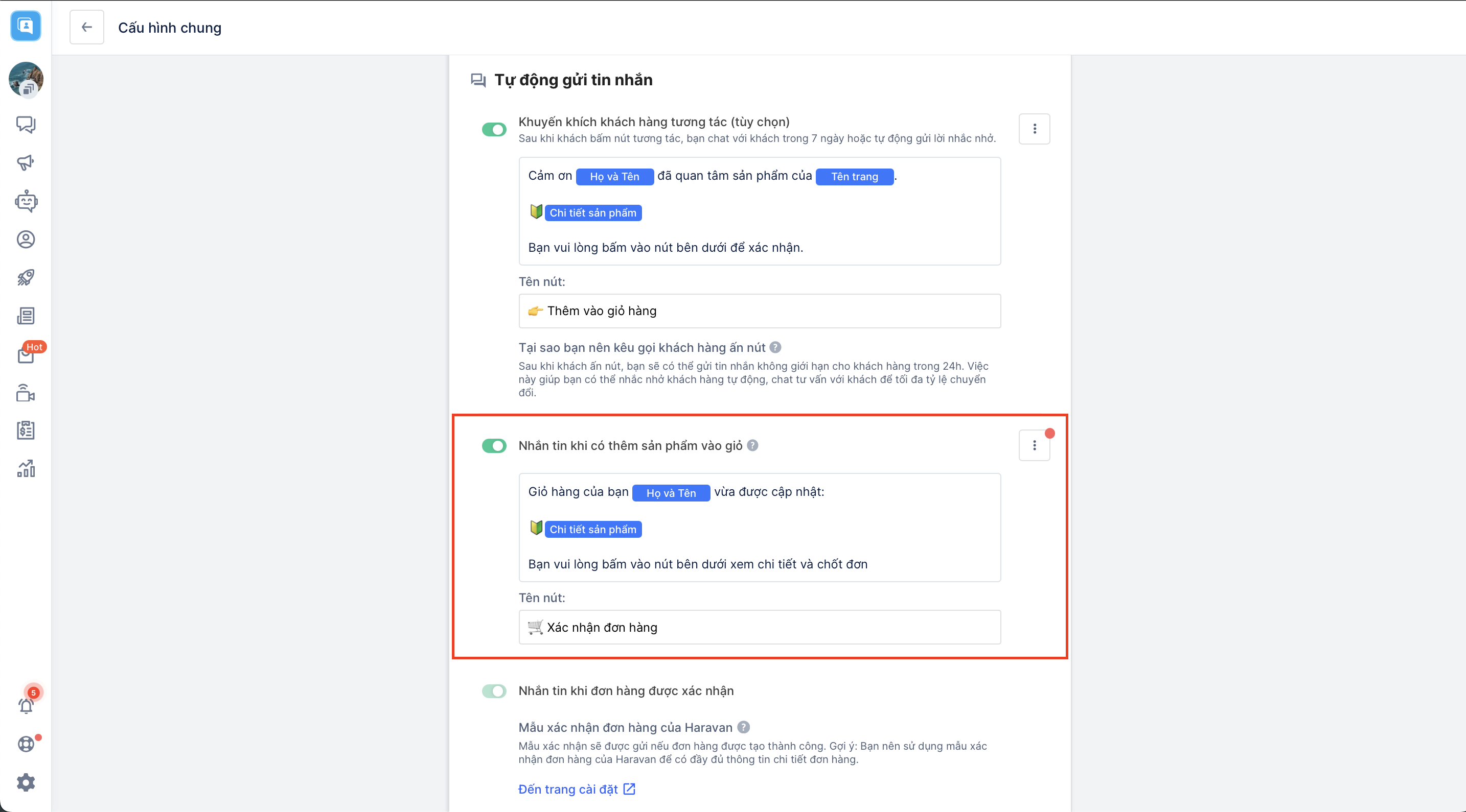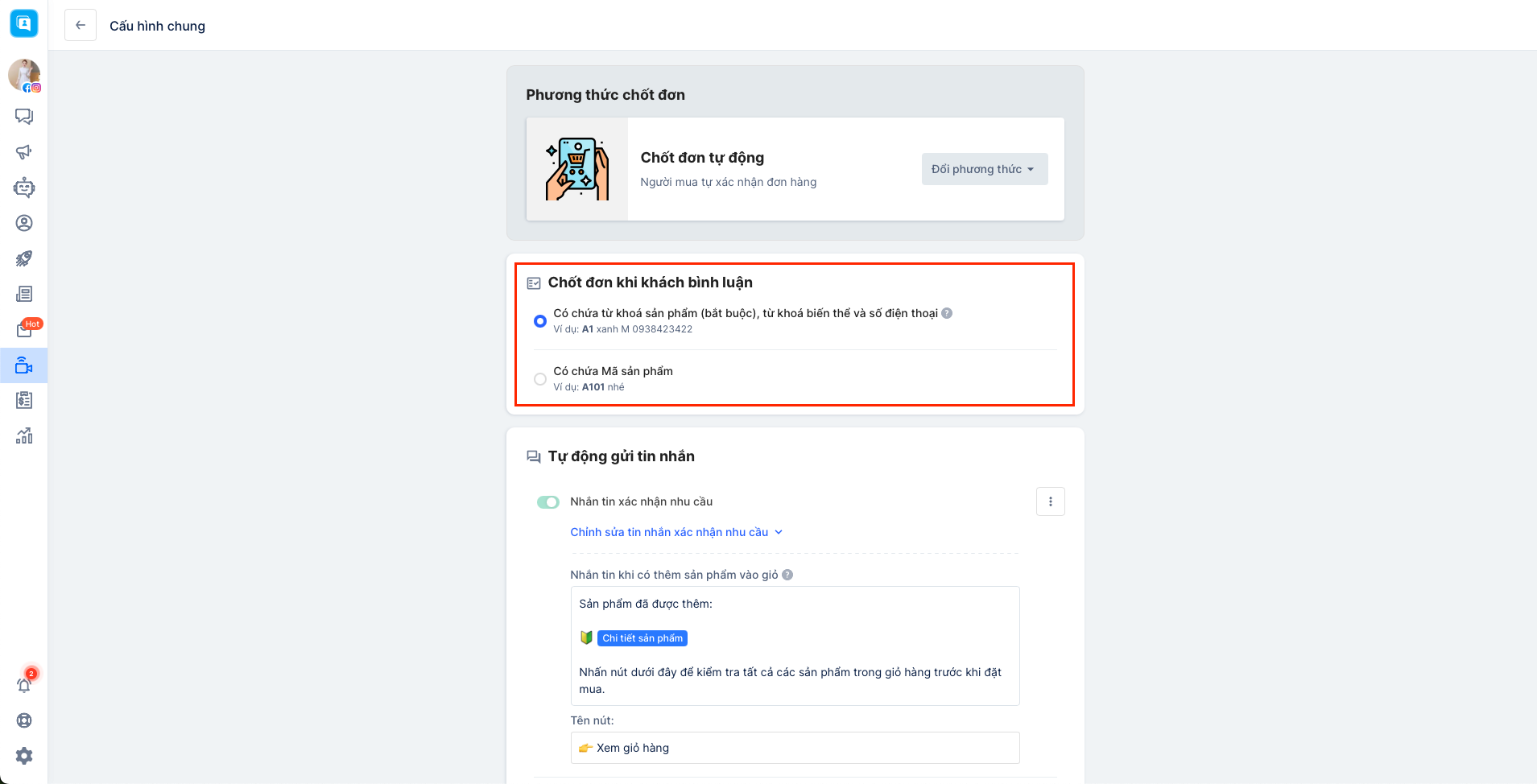 - Gửi tin nhắn nhắc các khách quên chưa xác nhận giỏ hàng:Sau khi bình luận đúng mã sản phẩm nhưng người mua chưa xác nhận đơn, hệ thống sẽ gửi tin nhắn để hướng dẫn và nhắc nhở khách hàng xác nhận đặt hàng dựa vào một trong các thời điểm gần nhất mà bạn đã thiết lập.