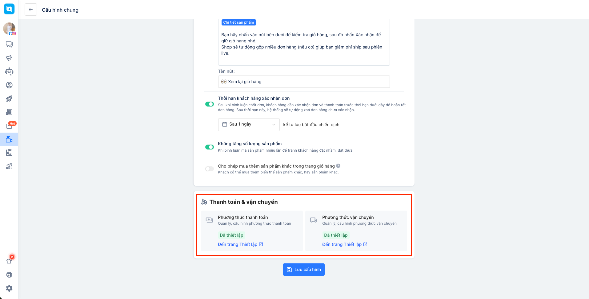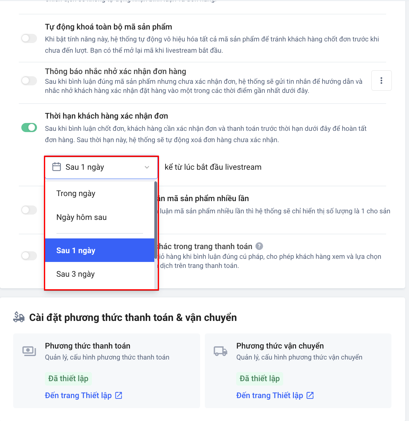 - Thời hạn khách hàng xác nhận đơn:Sau khi bình luận chốt đơn, khách hàng cần xác nhận đơn và thanh toán trước thời hạn dưới đây để hoàn tất đơn hàng. Sau thời hạn này, hệ thống sẽ tự động xoá đơn hàng chưa xác nhận. Bạn có thể thiết lập thời gian tùy chỉnh.