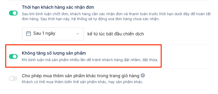 - Không tăng số lượng sản phẩm: Khi bật cấu hình, nếu khách hàng bình luận mã sản phẩm nhiều lần thì hệ thống chỉ sẽ ghi nhận hiển thị số lượng là 1 cho sản phẩm đó. Cấu hình hỗ trợ cho shop có tập đối tượng khách khi mua hàng comment 1 mã liên tục nên hệ thống ghi nhận số lưọng sản phẩm dựa trên nhiều mã đó và không kiểm tra lại trên giỏ hàng → dẫn đến khi giao hàng bị thừa sản phẩm, đơn phải hoàn lại.