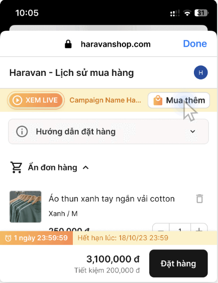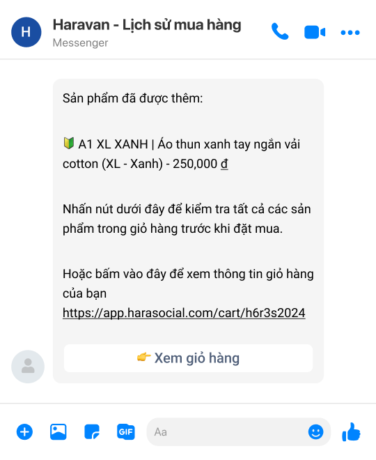 Sau khi khách ấn nút "Thêm vào giỏ hàng", nhà bán hàng sẽ có thể gửi tin nhắn không giới hạn cho khách hàng trong vòng 24 tiếng. Tính năng này giúp doanh nghiệp có thể nhắc nhở khách hàng tự động, chat với khách để tư vấn bán hàng, tối đa tỷ lệ chuyển đổi.**