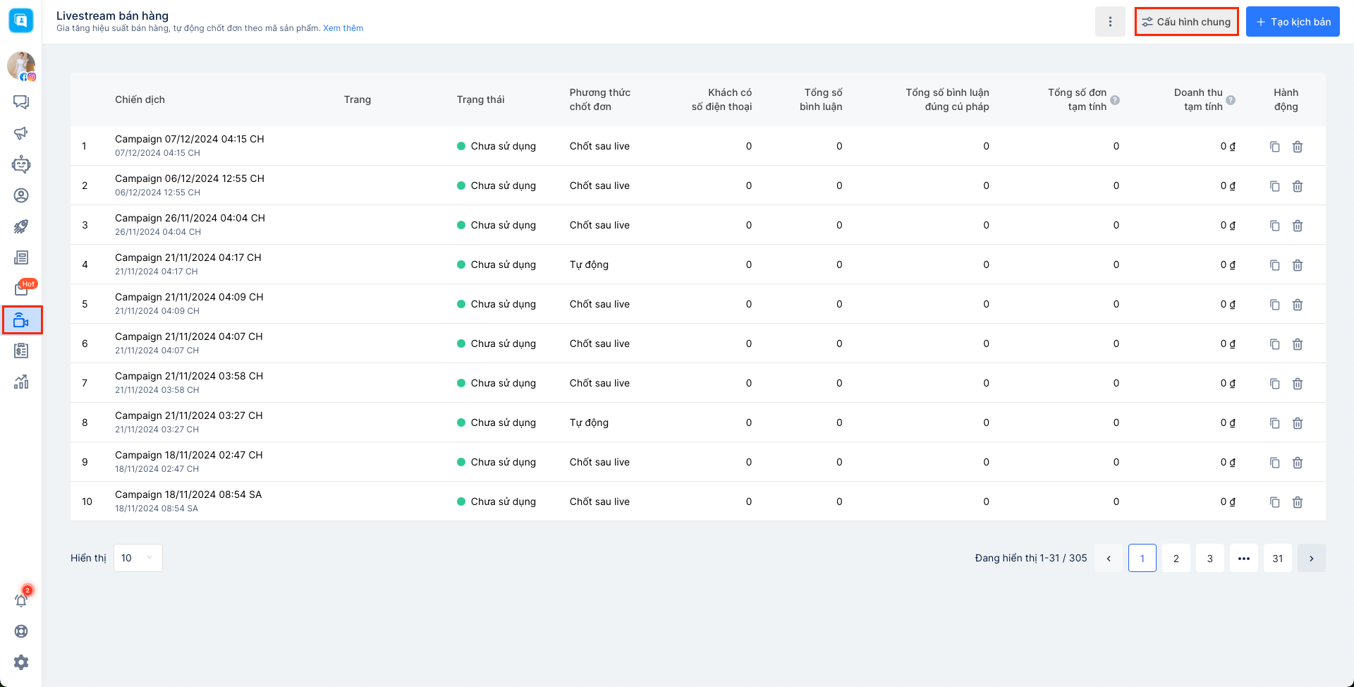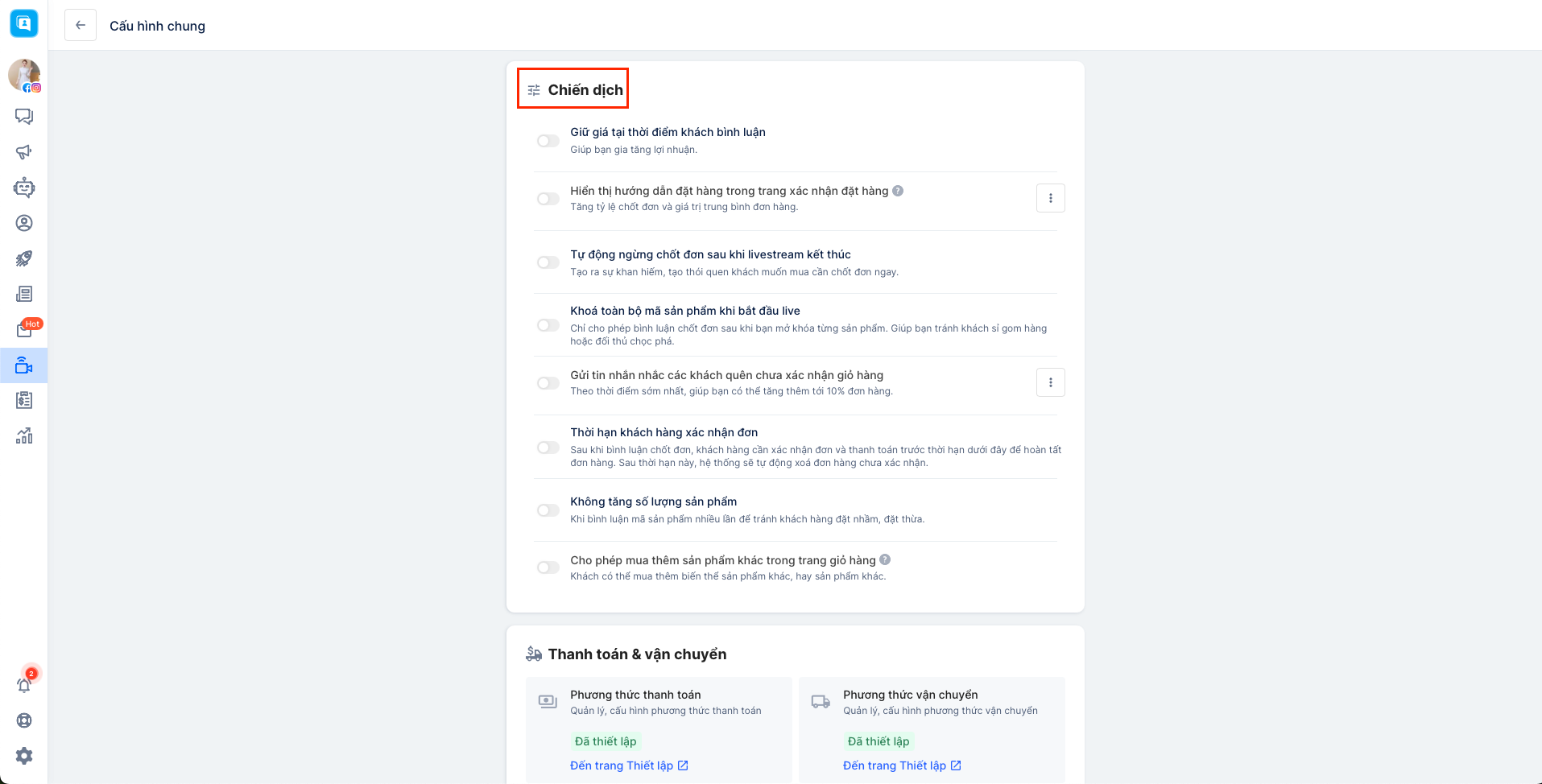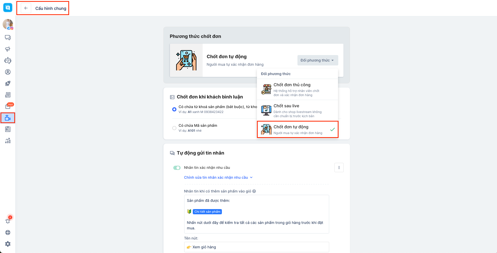 Khác với phương thức chốt đơn thủ công, phương thức chốt đơn tự động tại Livestream Version 2 sẽ bổ sung thêm một số cài đặt nâng cao nhằm hỗ trợ cho việc kinh doanh trên Livestream một cách thuận lợi hơn. Vì việc thiết lập cấu hình phương thức chốt đơn sẽ được thực hiện trong lần đầu tiên bạn sử dụng Livestream và áp dụng cho tất cả các trang có trong org (tài khoản) của bạn nên để thay đổi phương thức, bạn cần truy cập vào Cấu hình chung: