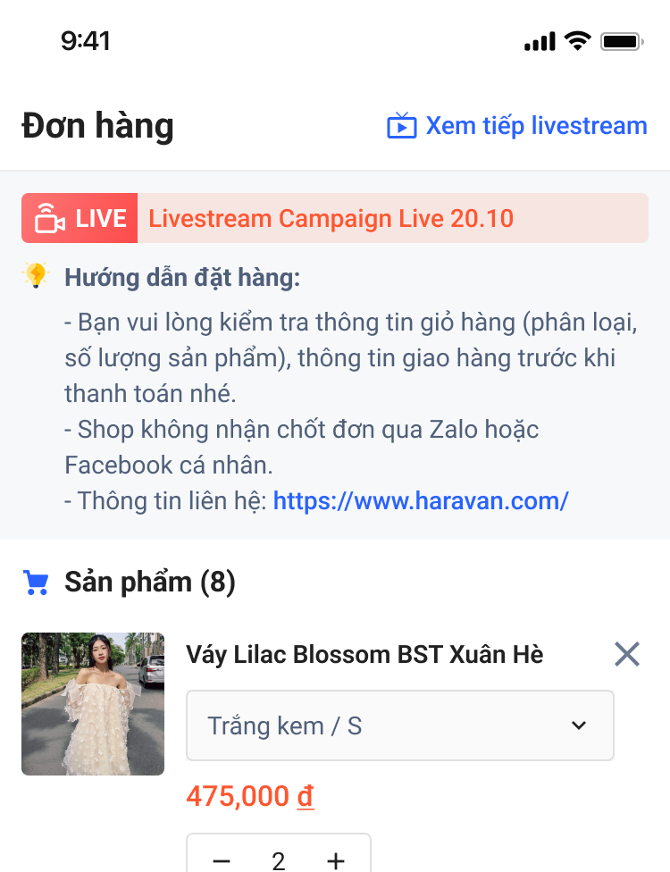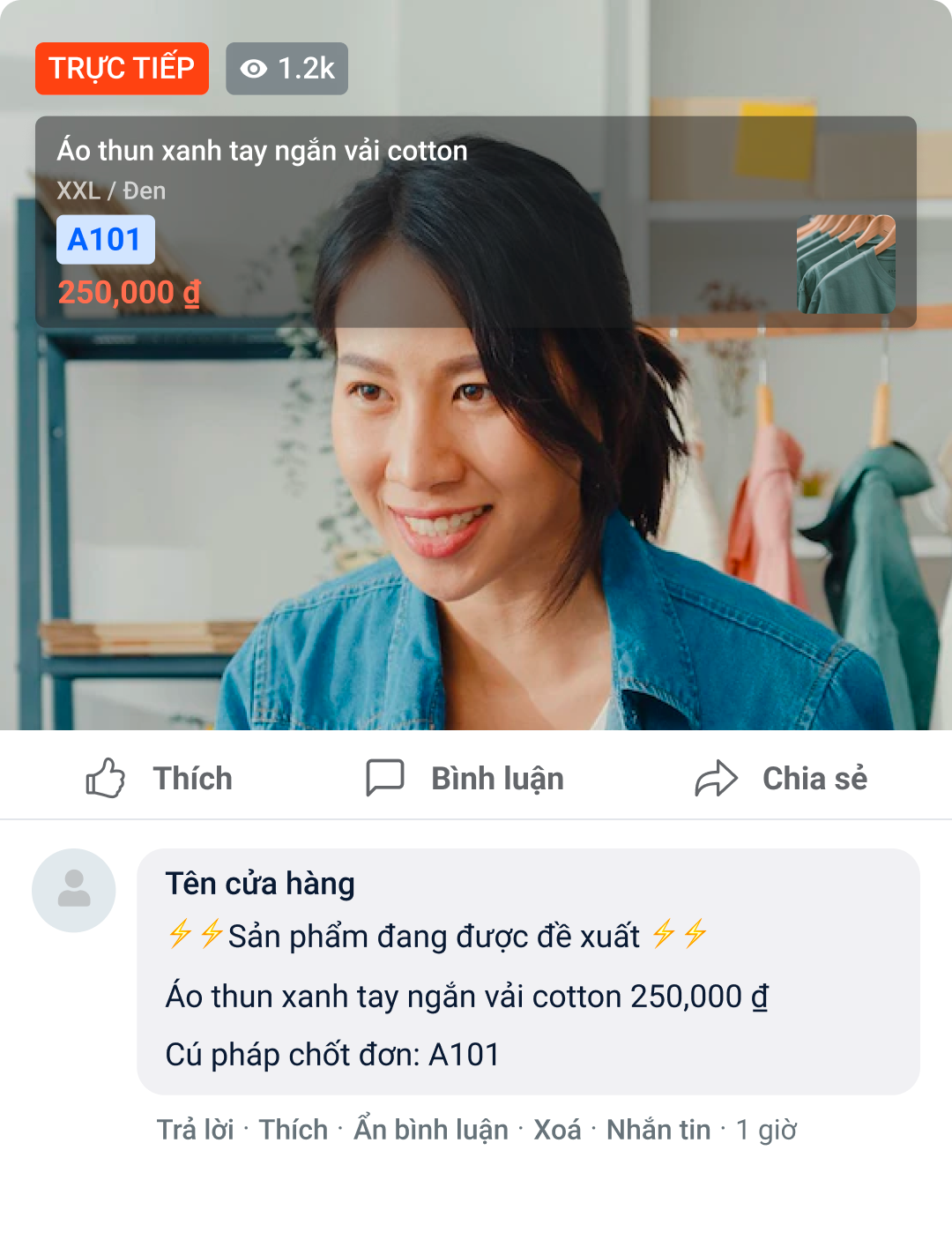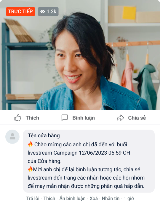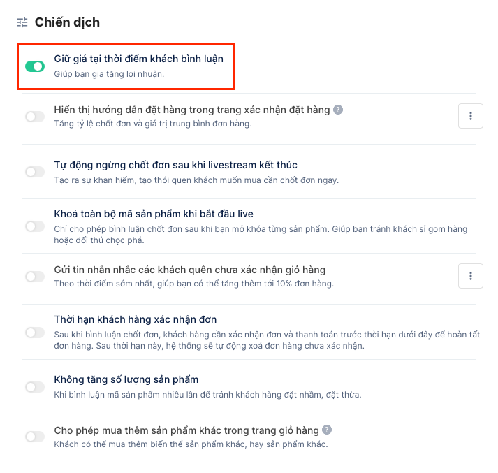 - **Giữ giá sản phẩm tại thời điểm bình luận:**hỗ trợ giữ giá tại thời điểm khách hàng bình luận, giúp gia tăng lợi nhuận. Ví dụ: Giá sản phẩm ban đầu là 300.000, người mua bình luận để chốt đơn với giá đó nhưng vẫn chưa hoàn tất đơn. Sau đó cuối phiên live shop giảm giá sản phẩm đó còn 250.000 và khi khách hàng vào trang thanh toán sẽ thấy giá vẫn giữ nguyên là 300.000.