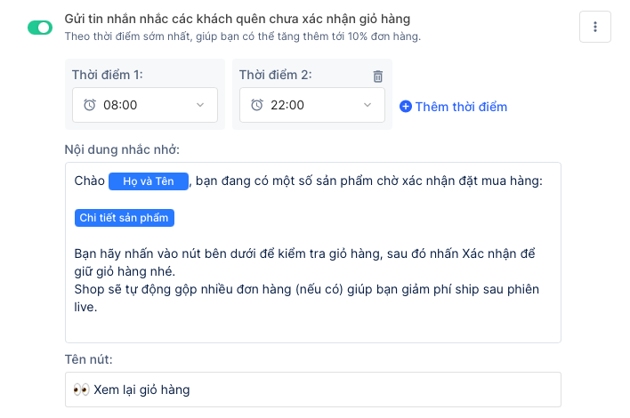 Bạn có thểthiết lập tối đa 3 thời điểm từ 7:00 đến 22:00để hệ thống gửi tin nhắn nhắc nhở xác nhận đơn. Cơ chế hoạt động của tính năng như sau: