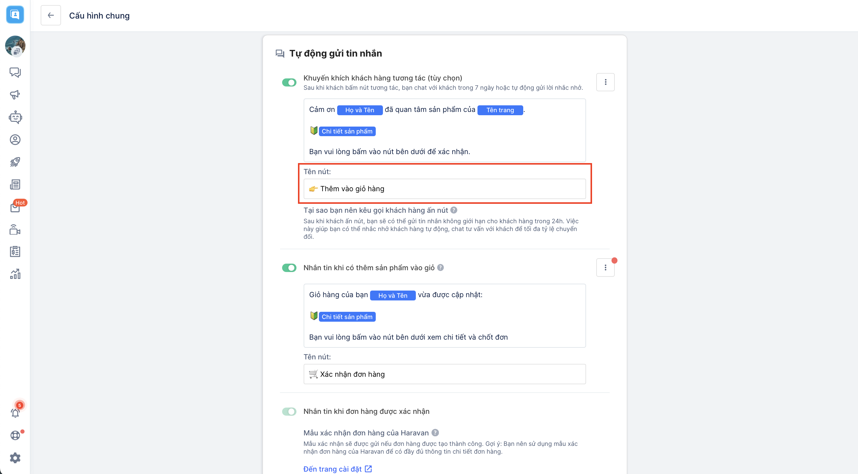 - *Nhắn tin khi có thêm sản phẩm vào giỏ:***Tin nhắn được gửi khi khách hàng đã có nhắn tin đến Fanpage và có lần tương tác cuối chưa quá 12 tiếng. Nhà bán hàng**có thể thiết lập nội dung tin nhắn + tên nút sẽ gửi ra khi khách hàng nhập cú pháp chốt đơn trên Livestream.