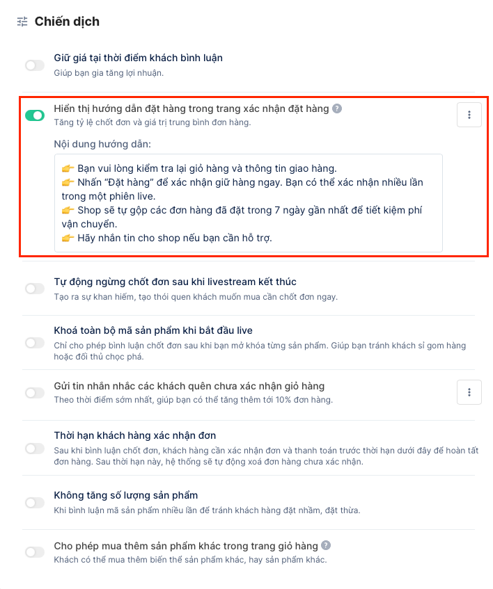 - Tự động ngừng chốt đơn sau khi Livestream kết thúc:Chiến dịch sẽ không tự động nhận thêm bình luận. Nếu không kích hoạt tính năng này, khi chiến dịch Livestream kết thúc, khách hàng vẫn có thể xem lại video Livestream đó và chốt đơn, khi đó nếu muốn ngừng nhận thêm đơn, bạn cần nhấn vào nút Ngừng chốt đơn tại đây.