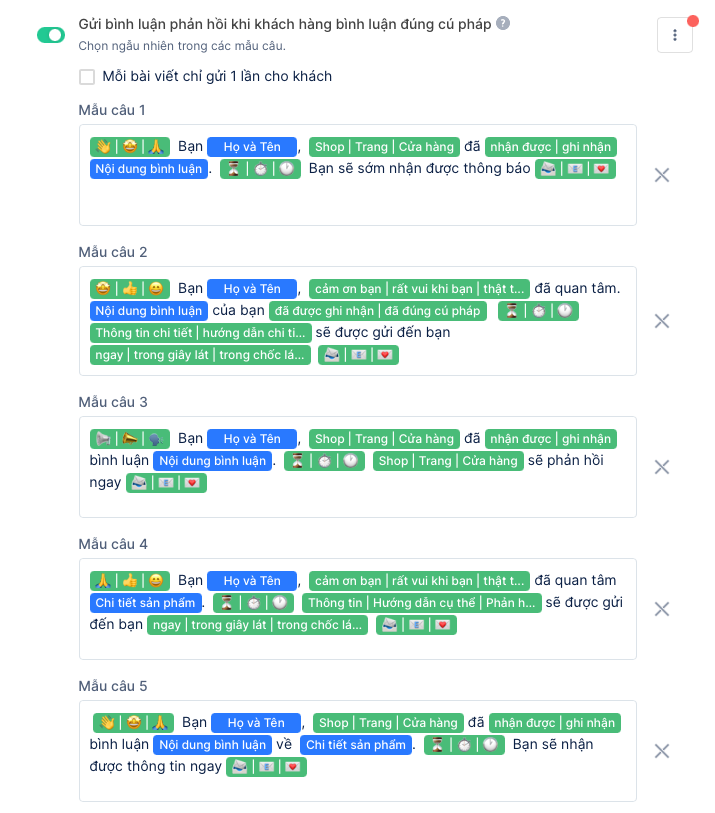 - Bình luận phản hồi khi khách hàng bình luận đúng cú pháp:Hệ thống sẽ tự động gửi bình luận phản hồi cho khách hàng theo nhiều mẫu câu ngẫu nhiên. Tại đây hệ thống sẽ hiển thị mặc định6 mẫu câu để gửi, bạn có thể thêm đượctối đa 10 mẫu câuvà hệ thống sẽ tự động phản hồi ngẫu nhiên xen kẻ trong 10 mẫu câu đó.