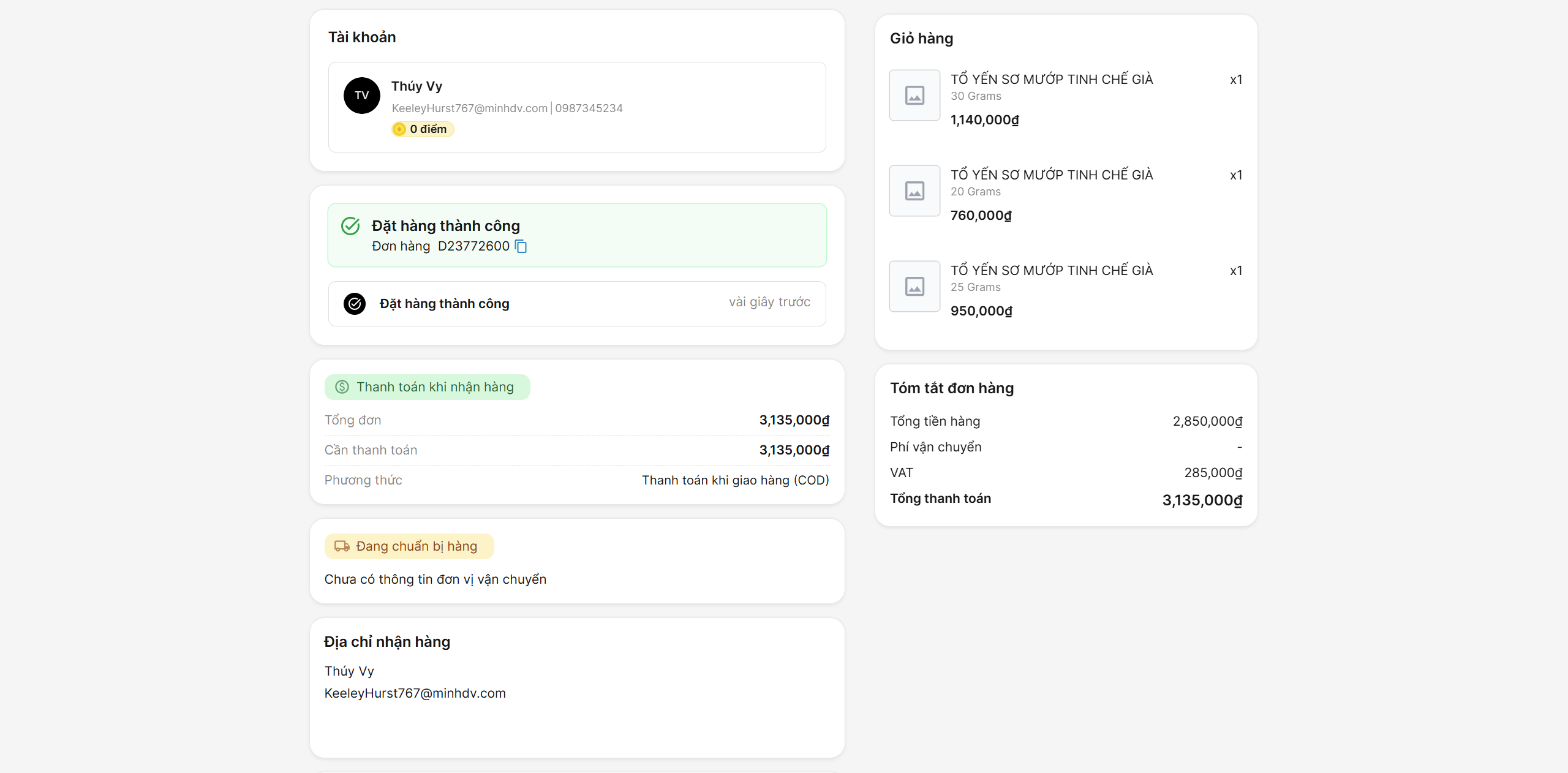 - Bước 3: Sau khi nhập đủ các thông tin giao hàng, người mua nhấn Đặt hàngđể hoàn thành đơn → hệ thống sẽ gửi đến người mua hóa đơn mẫu xác nhận đơn hàng như sau: