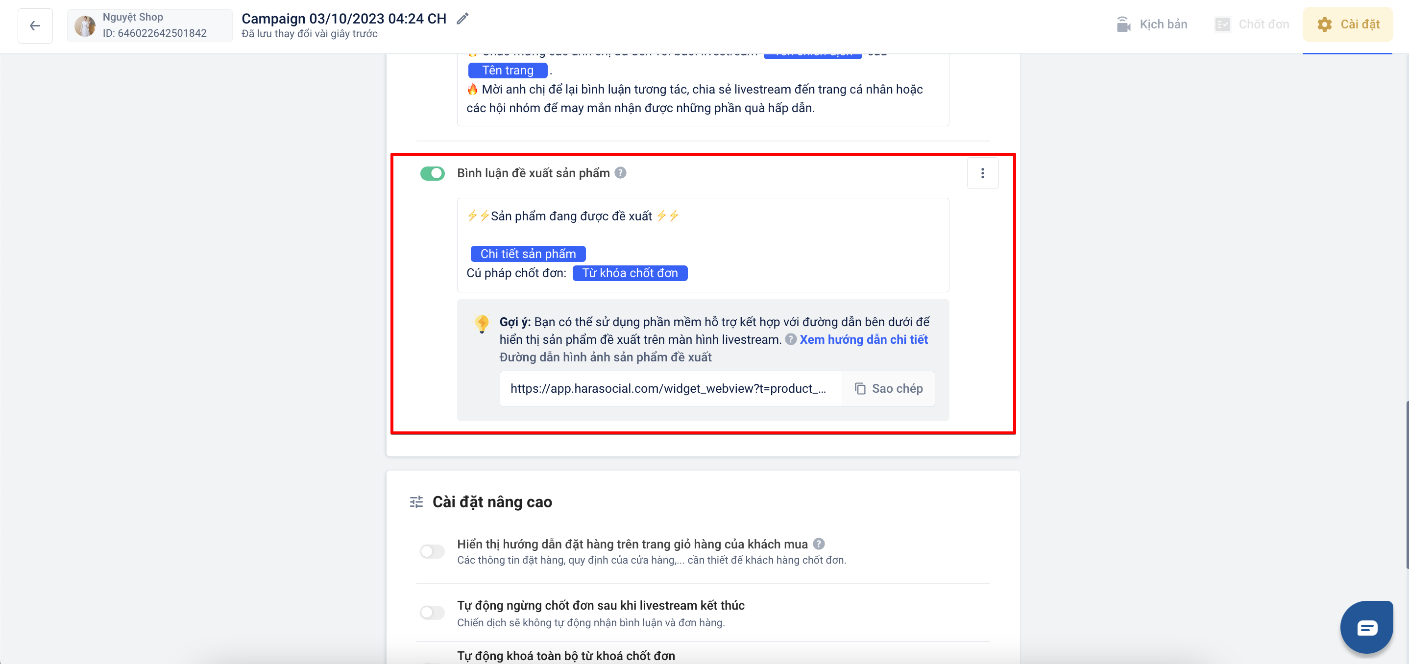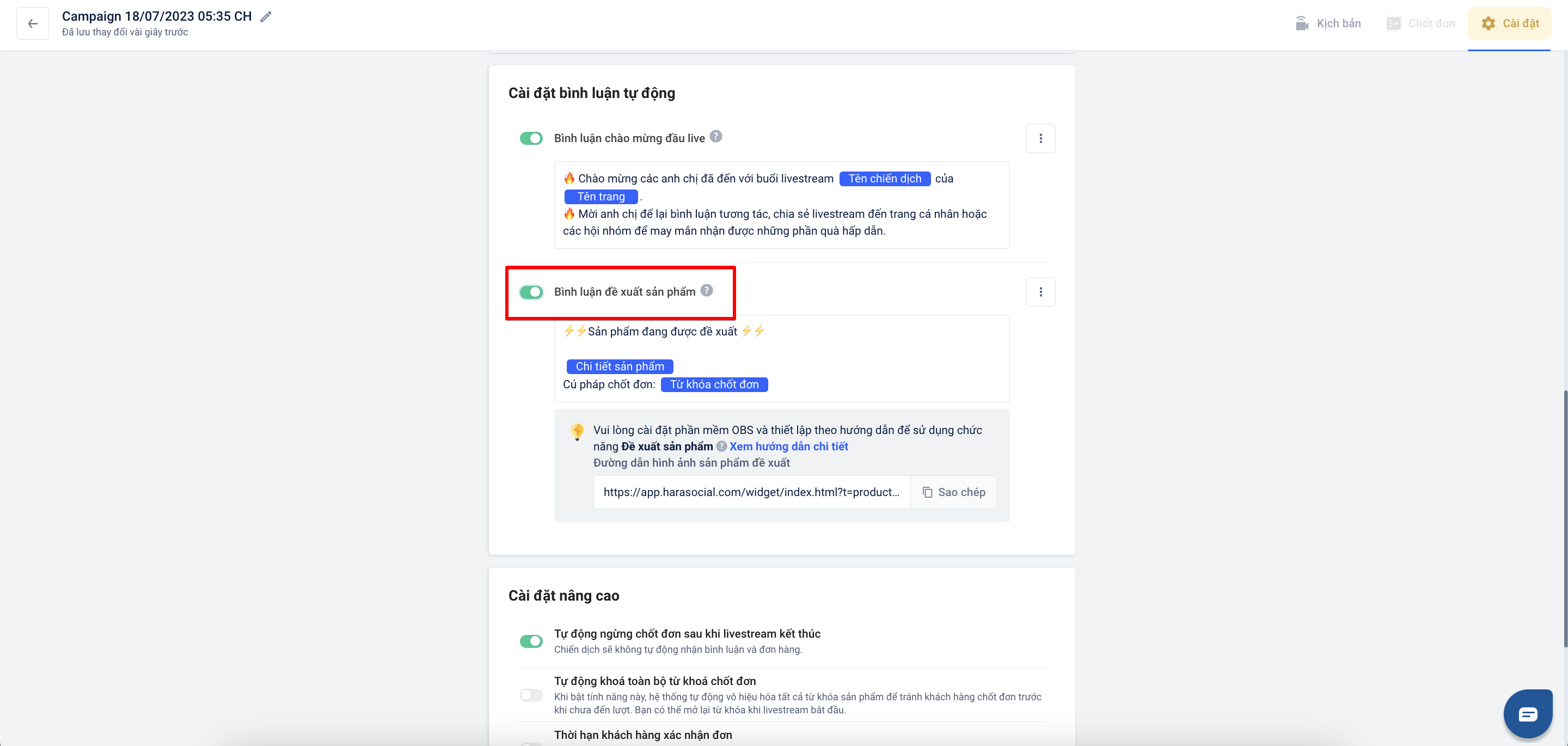 - Bạn cần lưu ý kích hoạt công cụ đề xuất sản phẩm để khi thiết lập tích hợp OBS thì tại Harasocial mới hiển thị nút ghim sản phẩm.